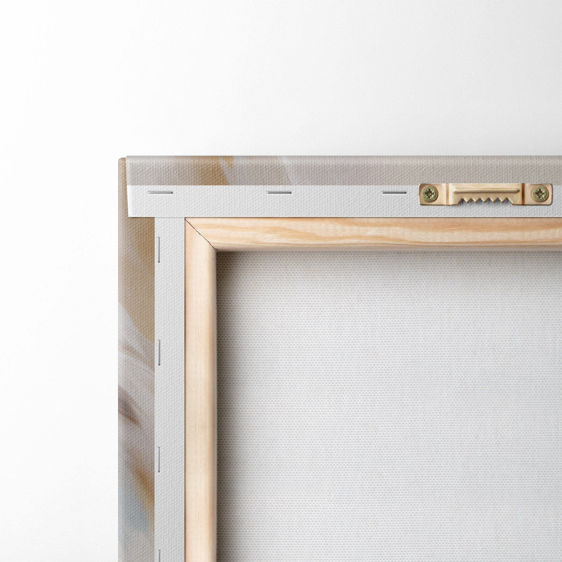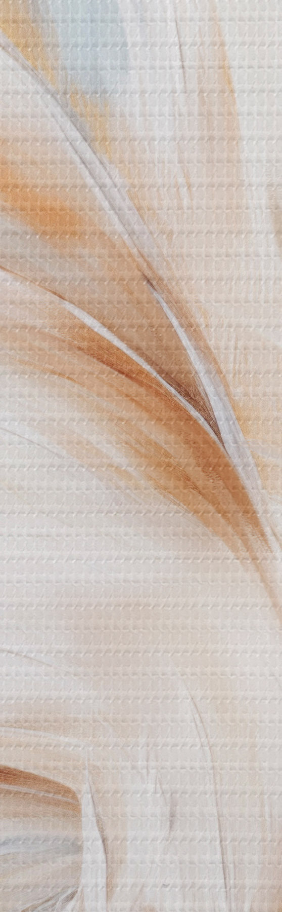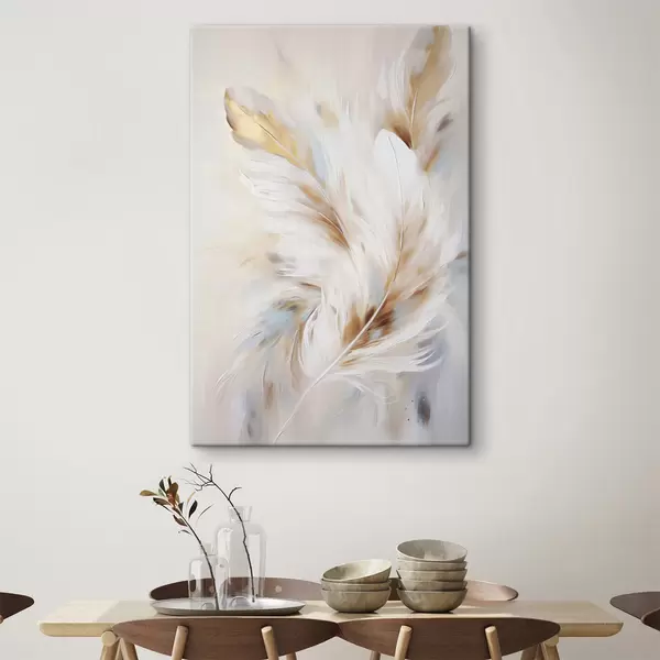 Pictură pe pânză Pene mari și moi, cu o combinație de nuanțe de alb, galben și maro, pe un fundal abstract și deschis. Nr s47442