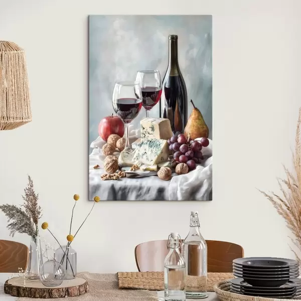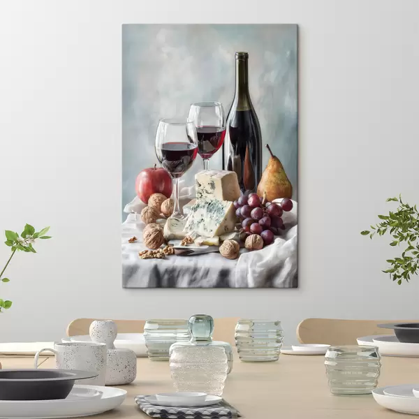 Pictură pe pânză natură moartă cu vin, brânză și nuci Nr s47686