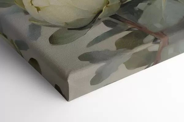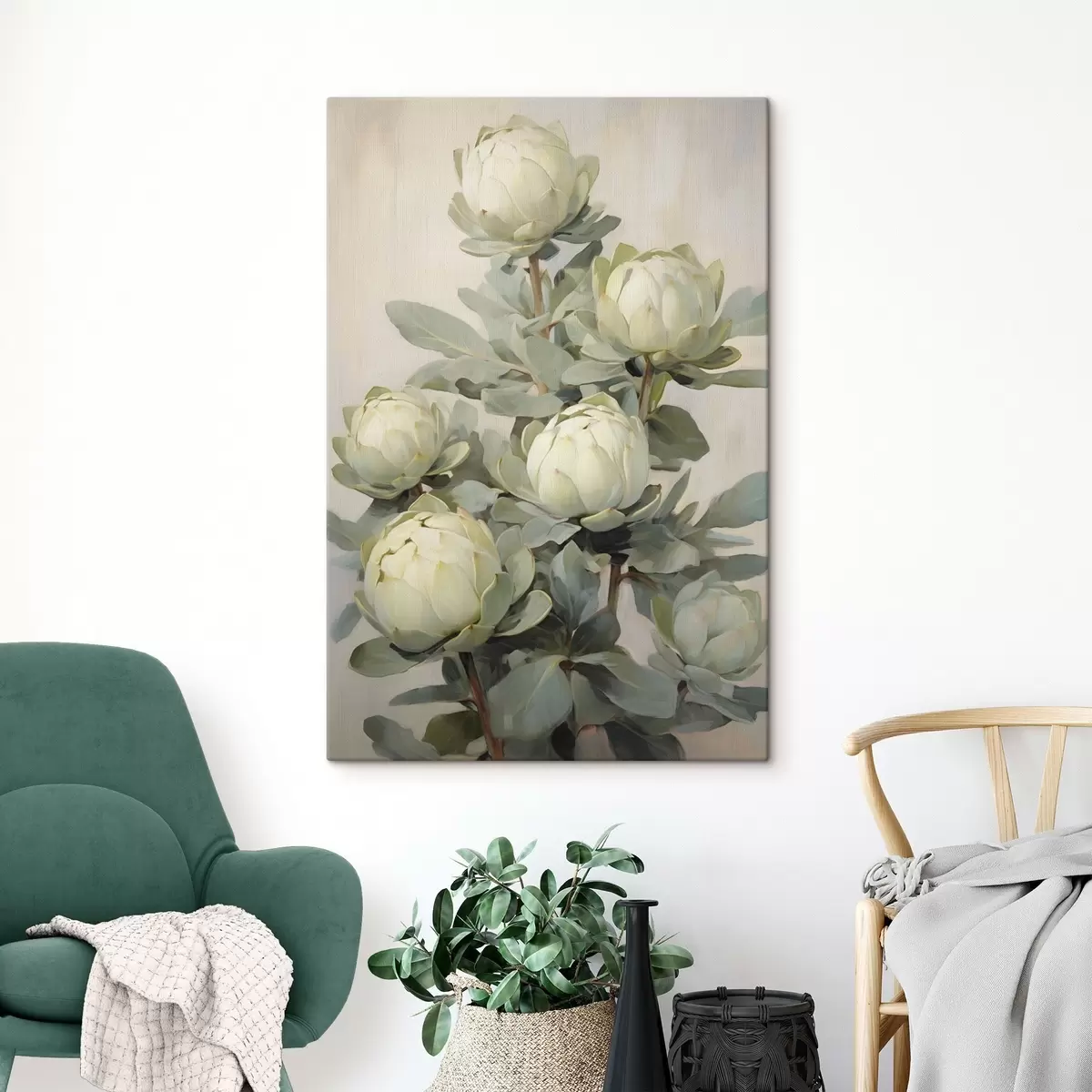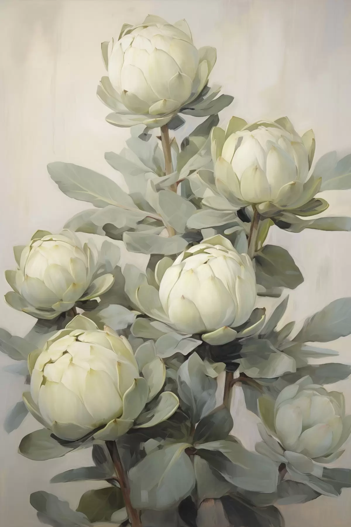 Pictură pe pânză Stil pictural reprezentând mai multe flori albe de protea cu frunze mari verzi pe un fundal deschis Nr s47861