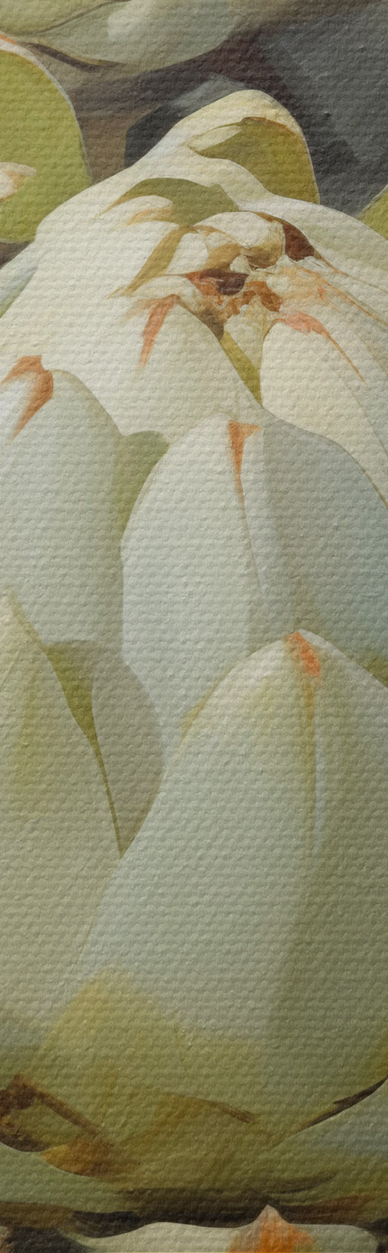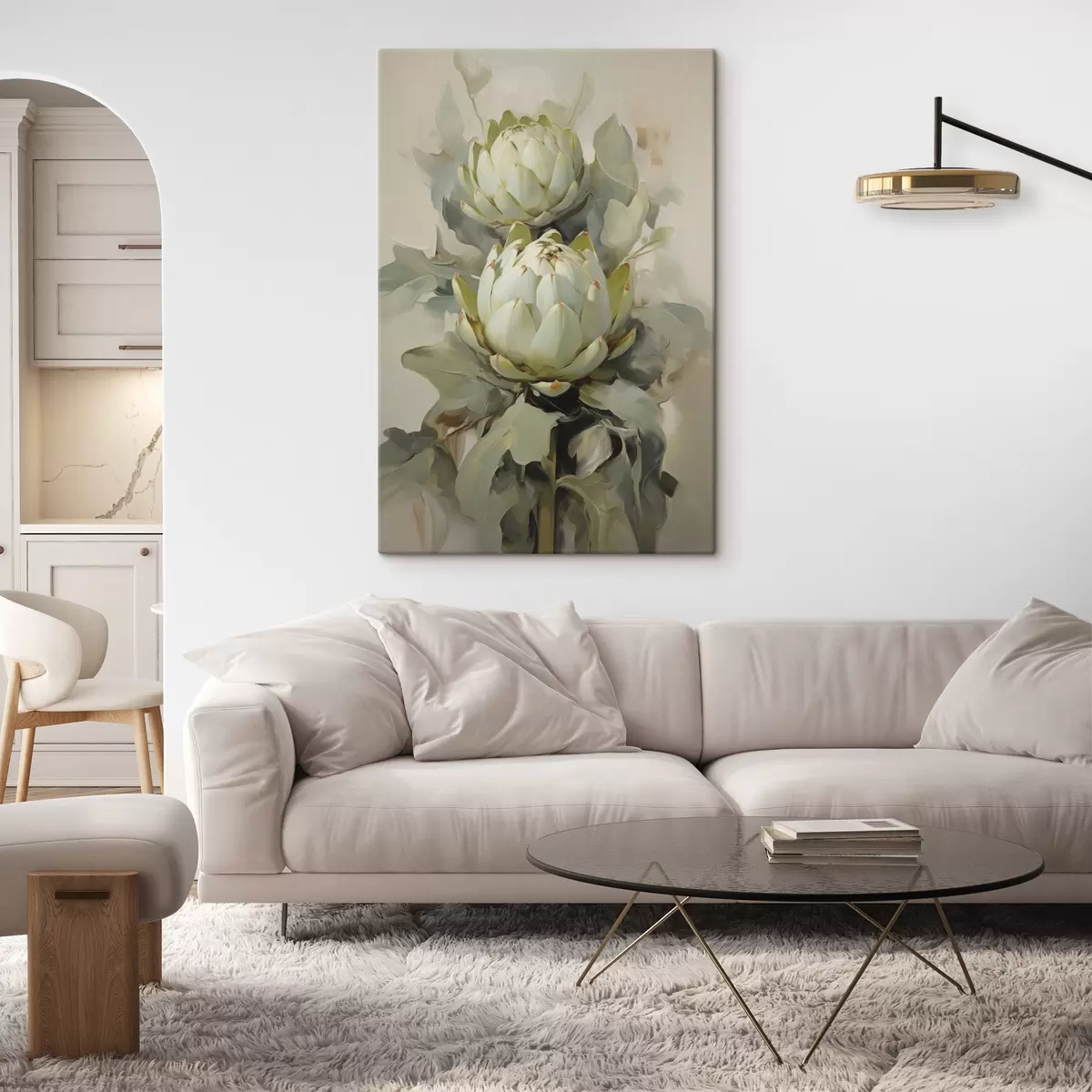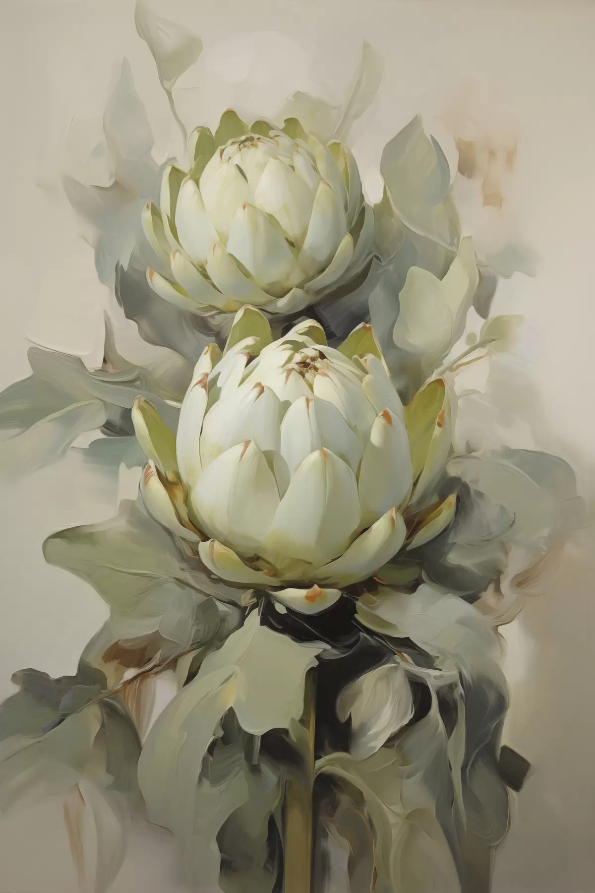 Pictură pe pânză Stil pictural reprezentând mai multe flori albe de protea cu frunze mari verzi pe un fundal deschis Nr s47862