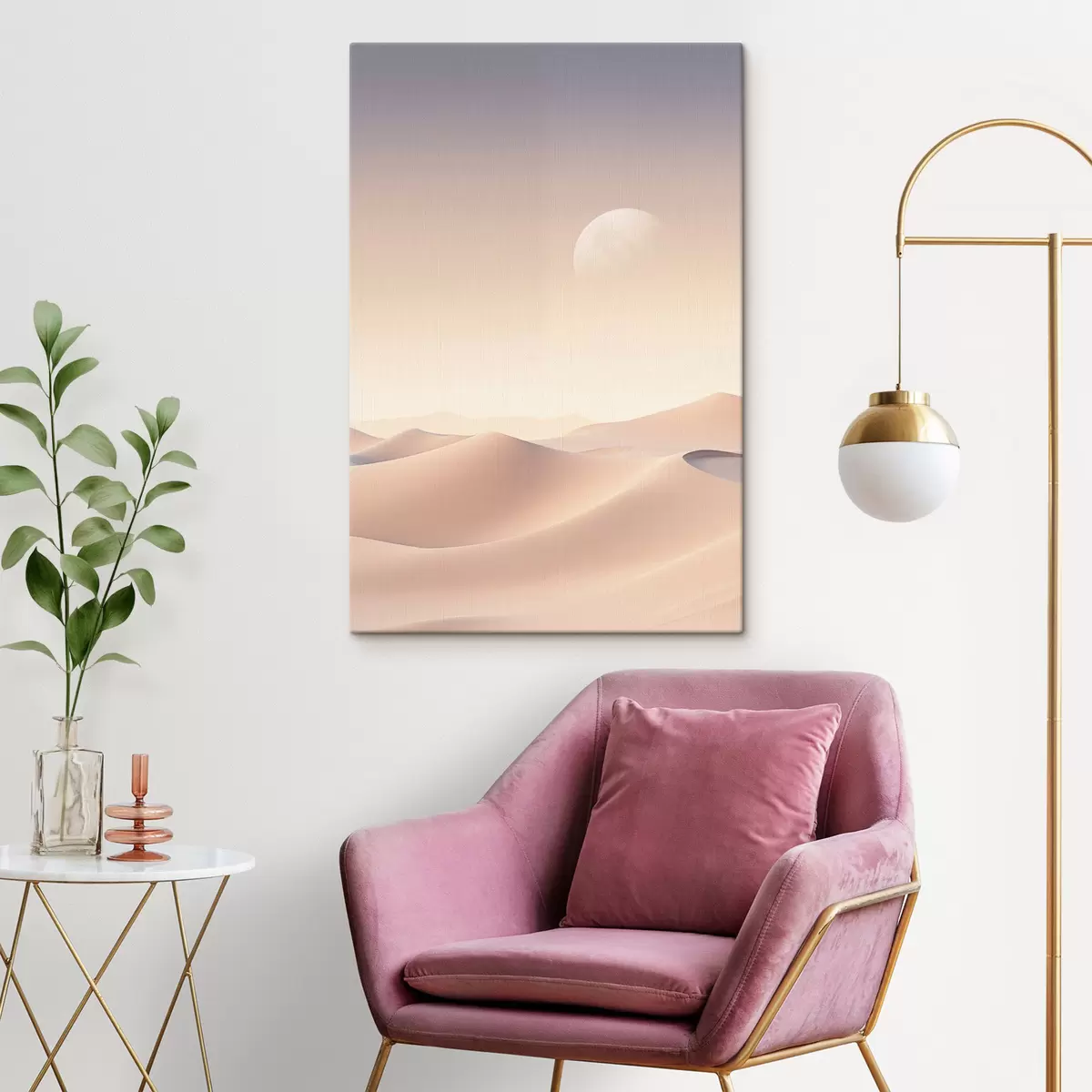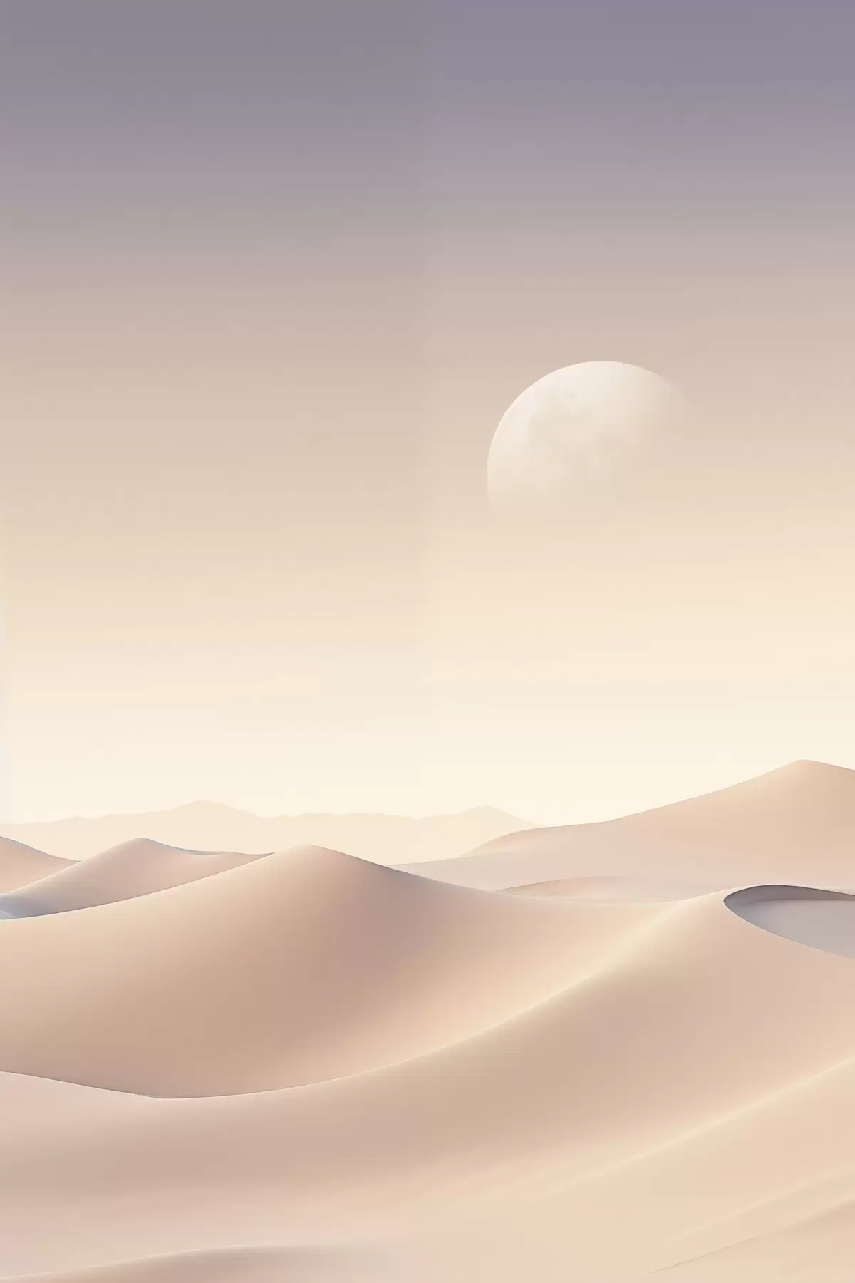 Tablouri Un peisaj deșertic cu dune de nisip ondulate sub un cer pastelat, munți îndepărtați în fundal s47866