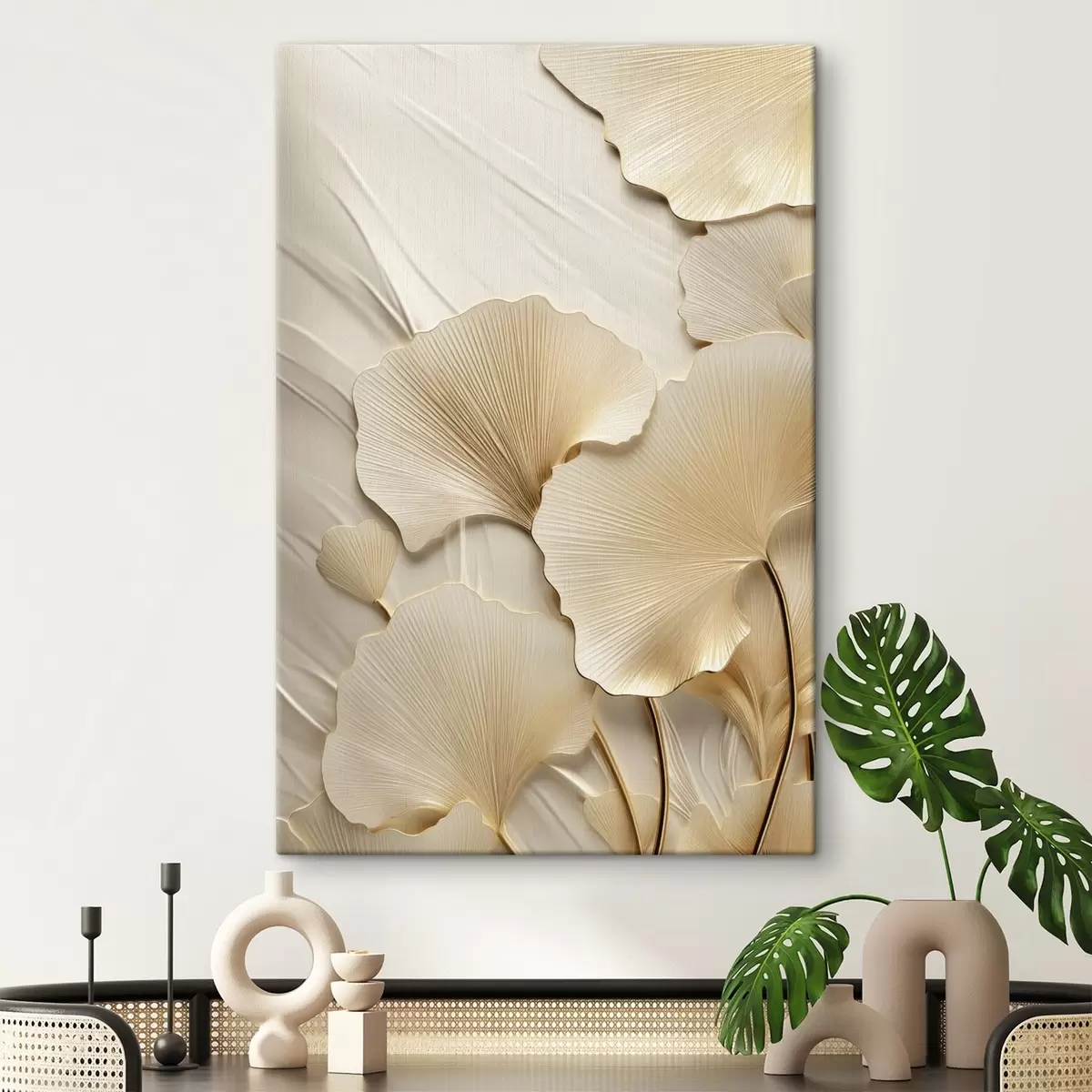 Tablouri Frunze abstracte de ginkgo pe un fundal texturat, deschis la culoare, compoziție elegantă și abstractă s47867