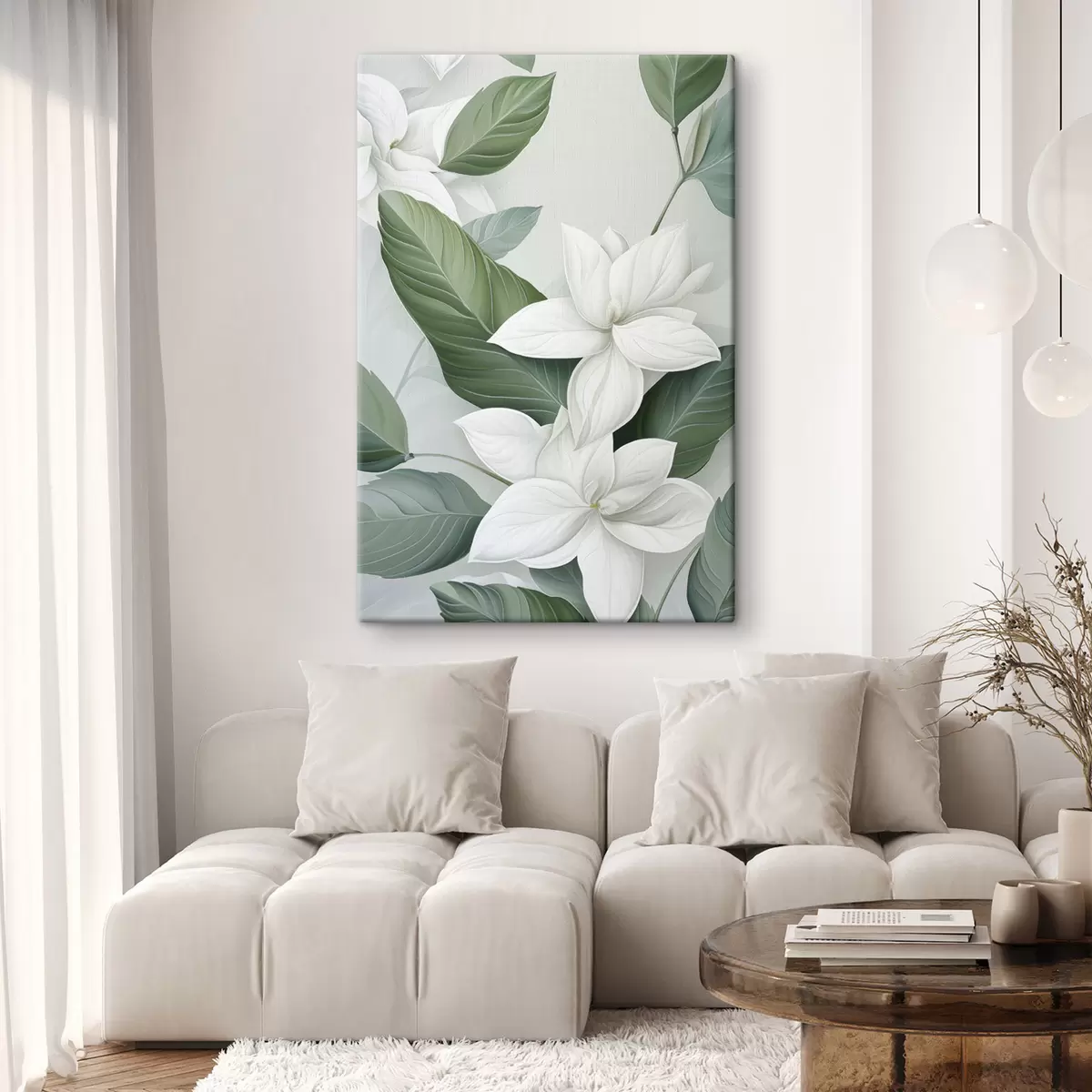 Tablouri Flori albe cu frunze verzi, fundal pastelat s47869