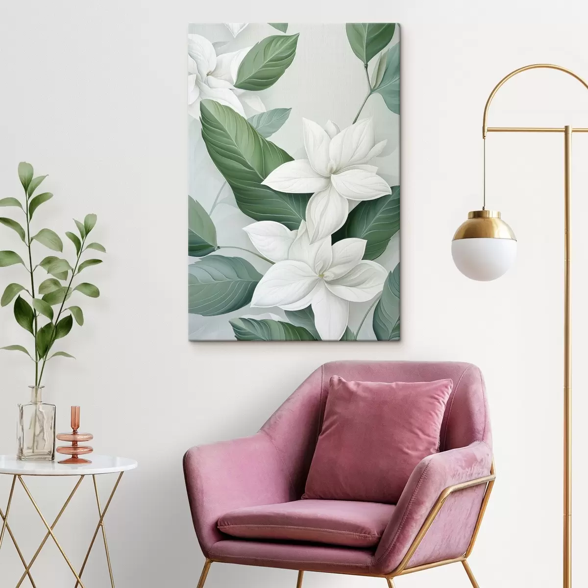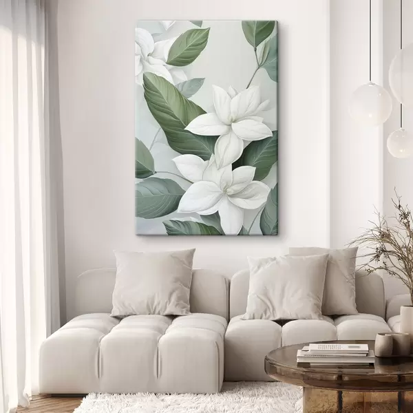 Pictură pe pânză Flori albe cu frunze verzi, fundal pastelat Nr s47869