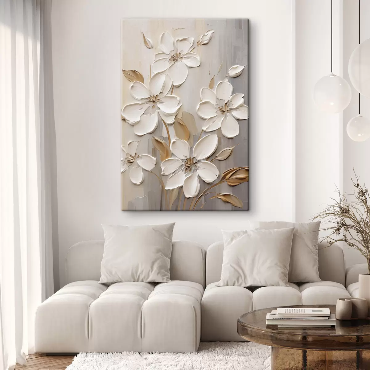 Tablouri Flori albe abstracte cu petale texturate, pe un fundal neutru cu imitații subtile de pensule s47874