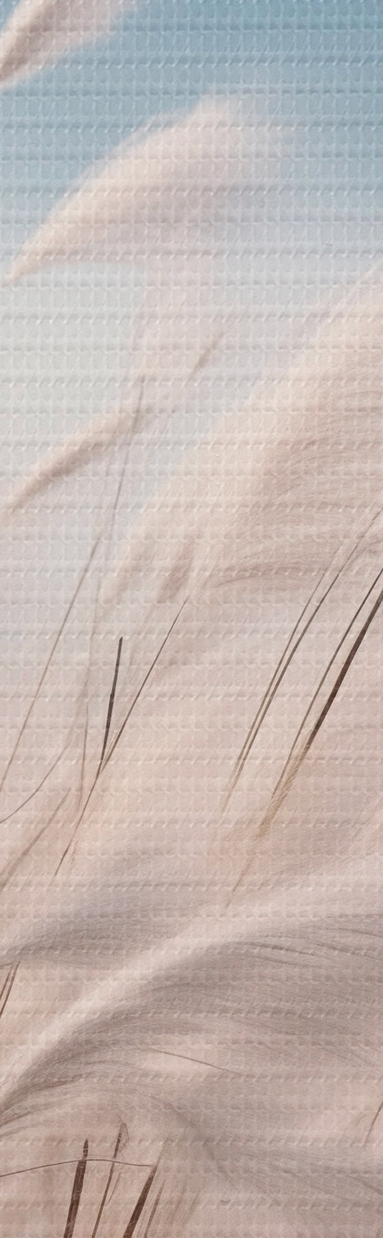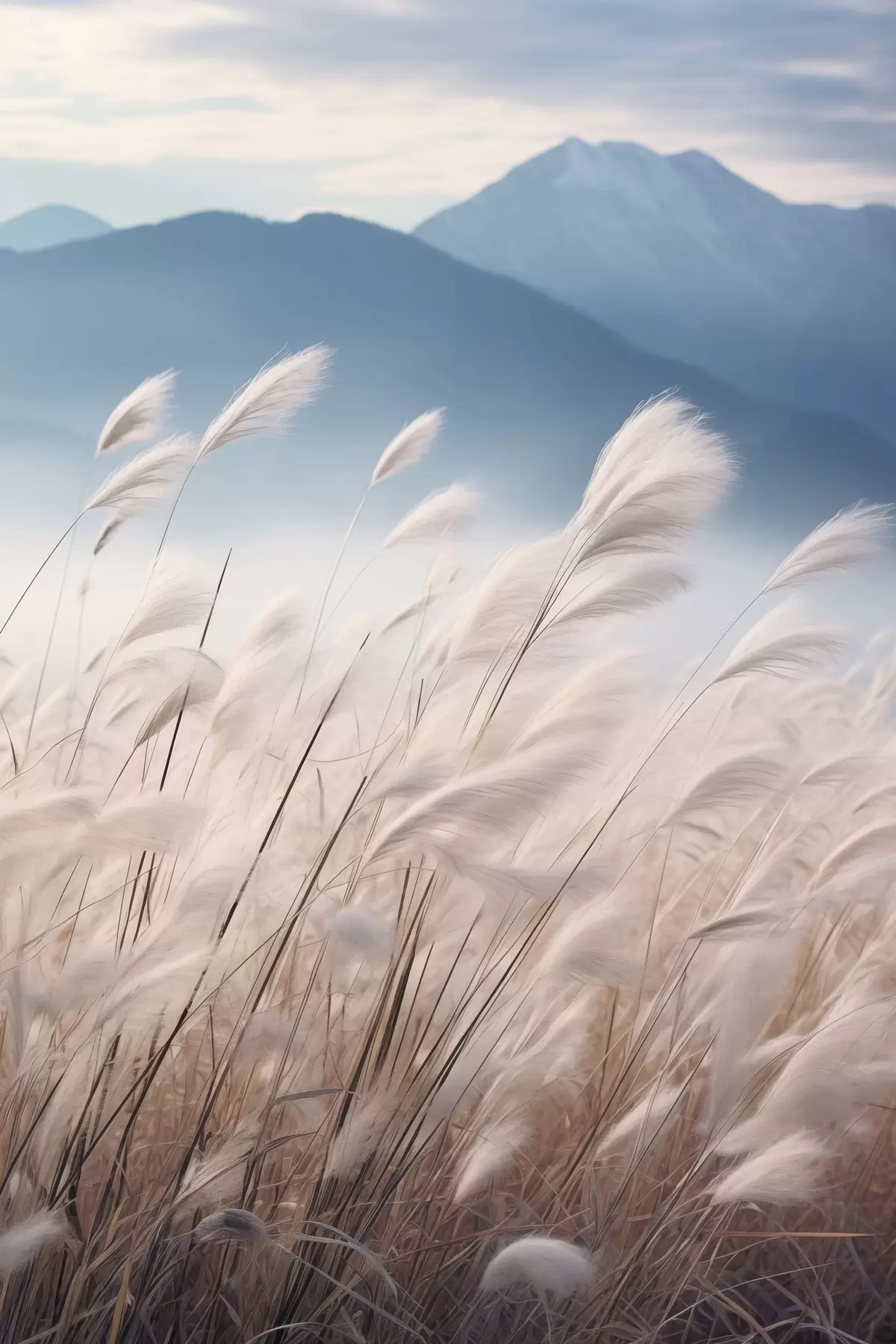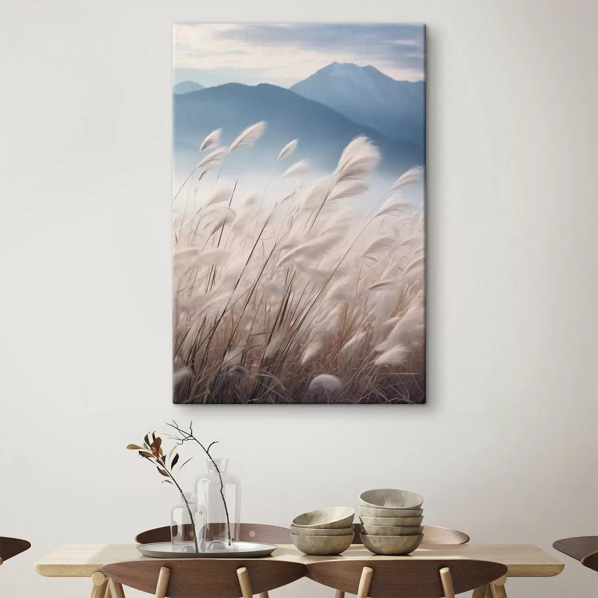 Pictură pe pânză Iarbă înaltă și albă de pampas, care se leagănă în vânt, cu munți albastru deschis în fundal Nr s47879