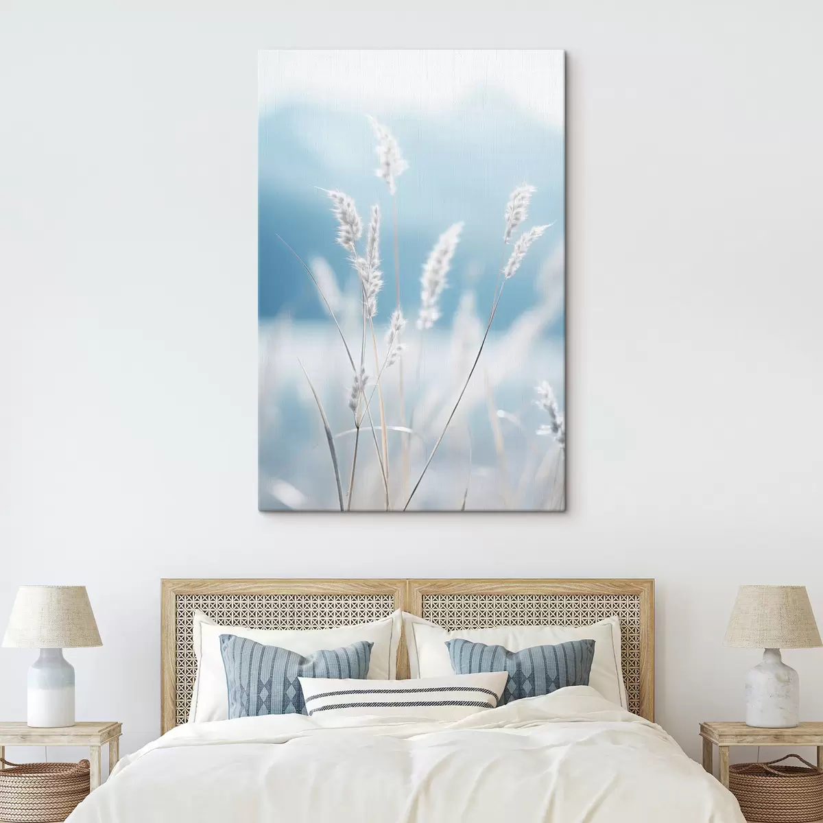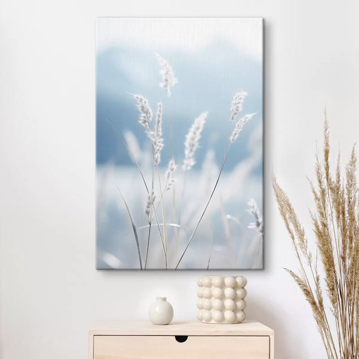 Pictură pe pânză Iarbă albă și pufoasă pe fundalul unui cer albastru deschis, cu o adâncime de câmp redusă Nr s47880