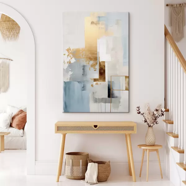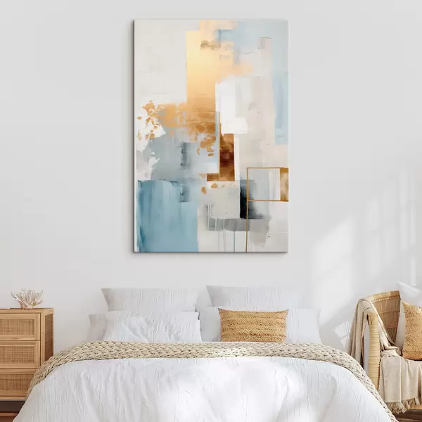 Pictură pe pânză Forme geometrice abstracte în culori galben, albastru și alb, compoziție texturată și minimalistă Nr s47881
