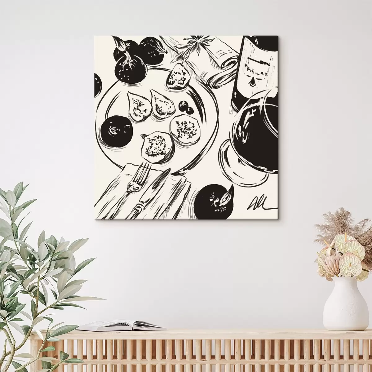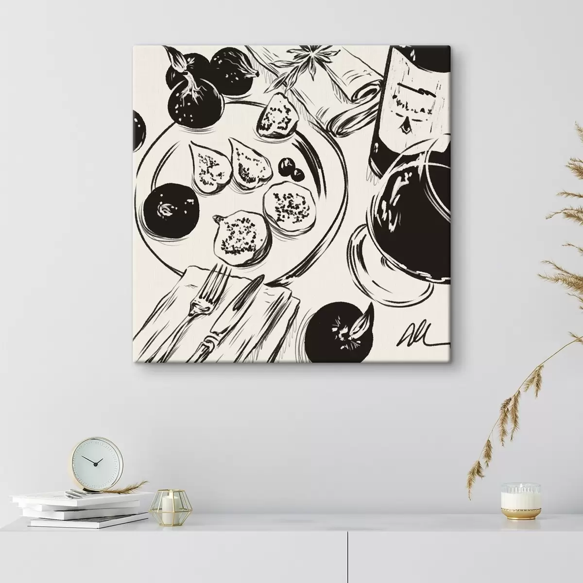 Pictură pe pânză Schiță în alb-negru reprezentând o masă cu fructe și un pahar Nr s48030