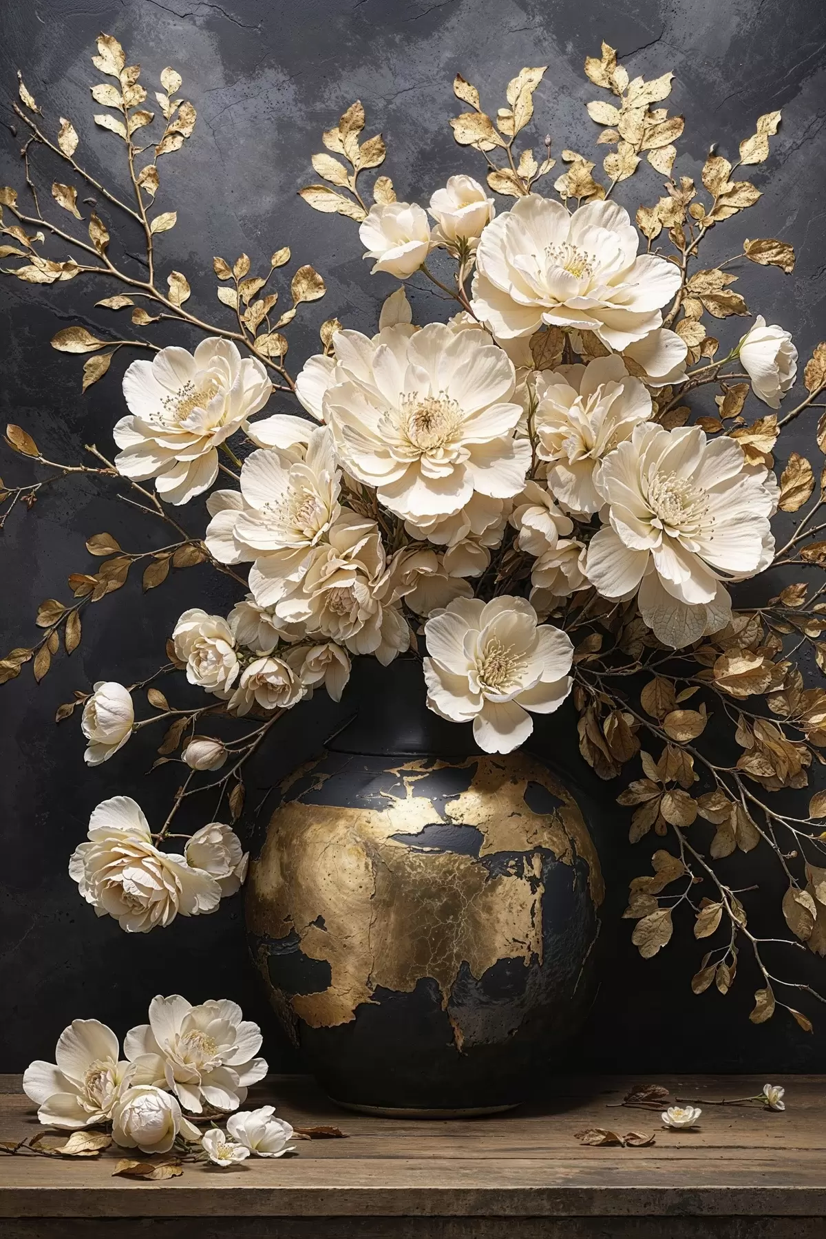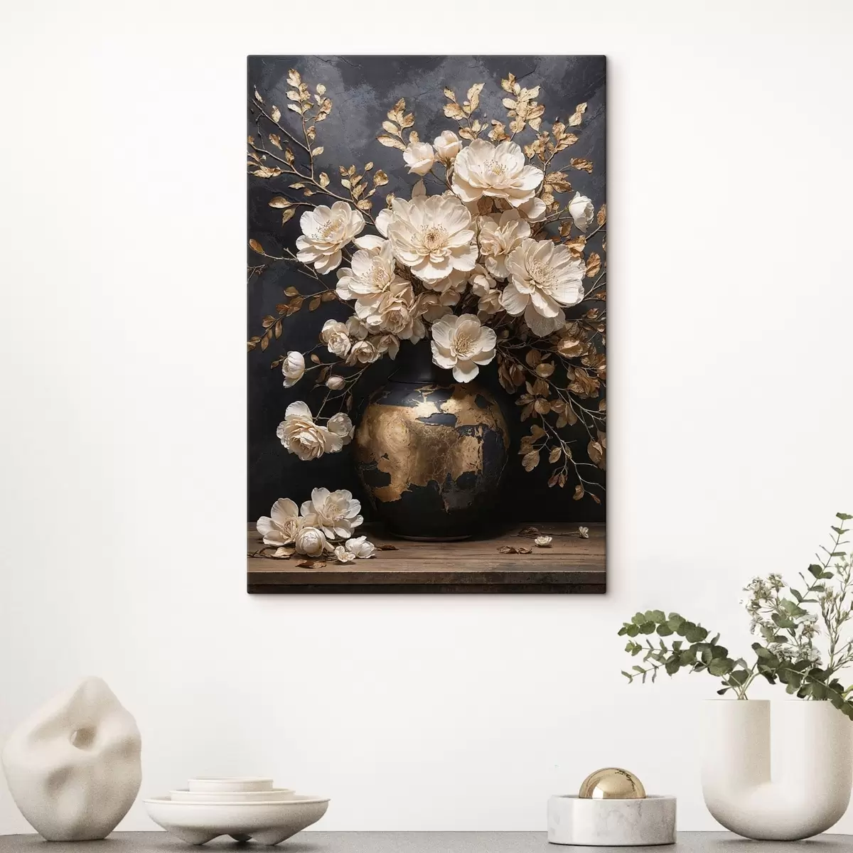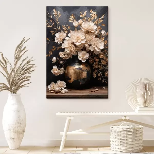 Tablouri Flori delicate într-o vază, însoțite de frunze decorative s48356