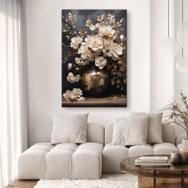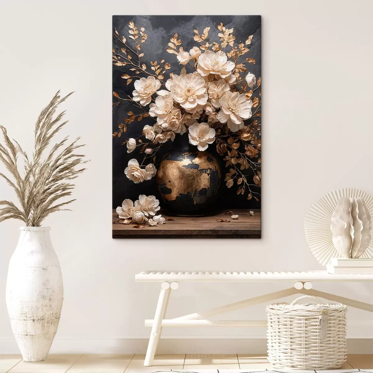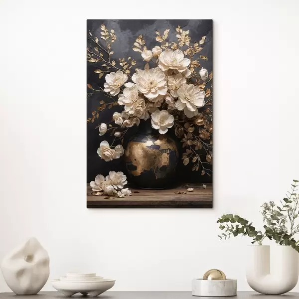 Pictură pe pânză Flori delicate într-o vază, însoțite de frunze decorative Nr s48356