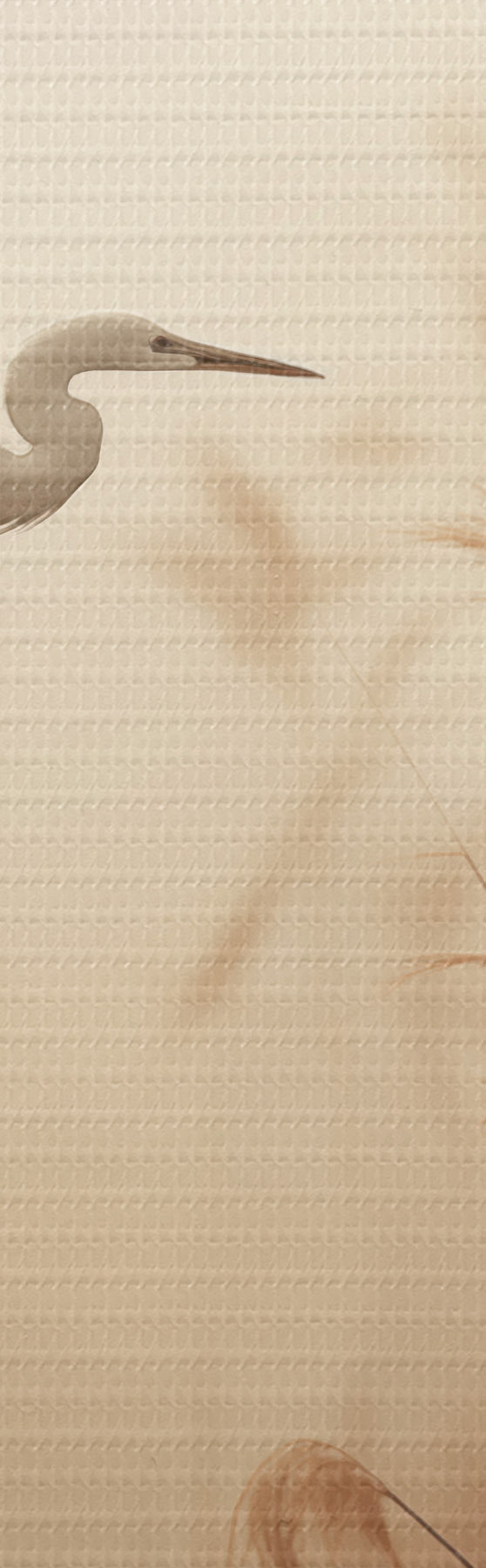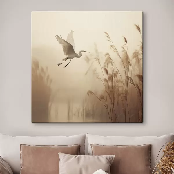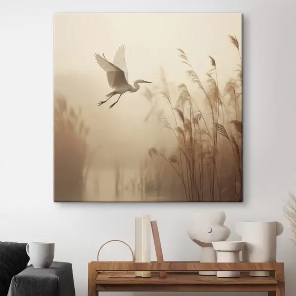 Pictură pe pânză O egretă albă zboară deasupra unui lac, înconjurată de stuf înalt și copaci în fundal Nr s48390