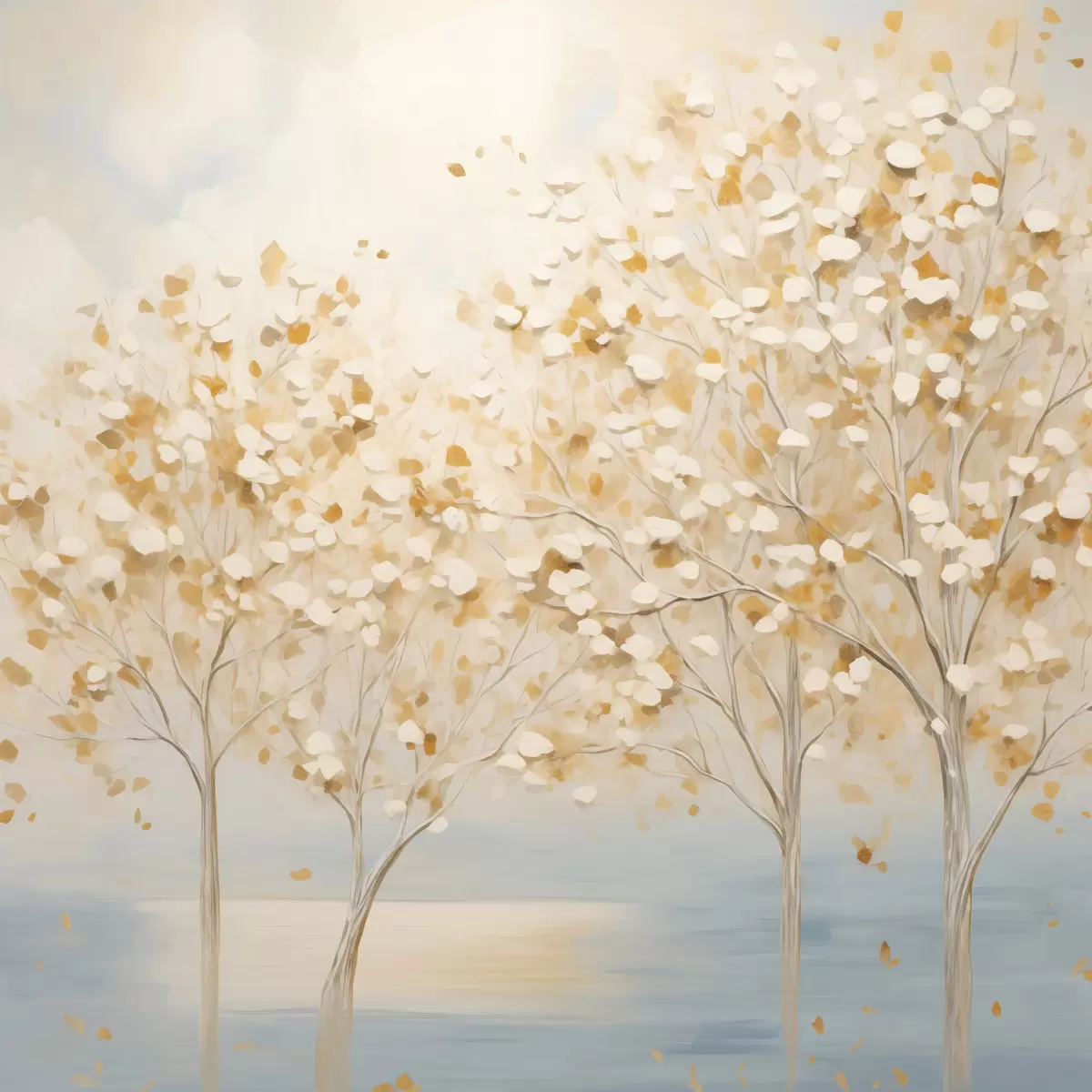 Tablouri Un stil pictural texturat reprezentând copaci cu frunze albe și galbene pe un fundal albastru deschis s48392