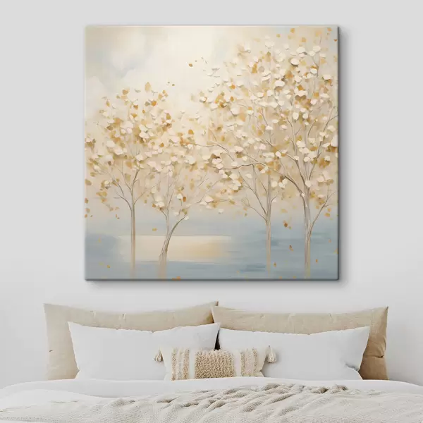 Pictură pe pânză Un stil pictural texturat reprezentând copaci cu frunze albe și galbene pe un fundal albastru deschis Nr s48392