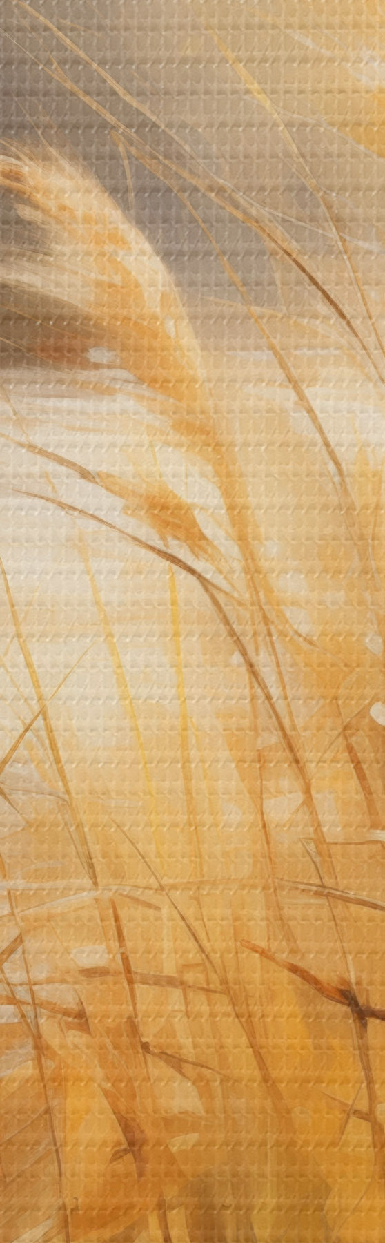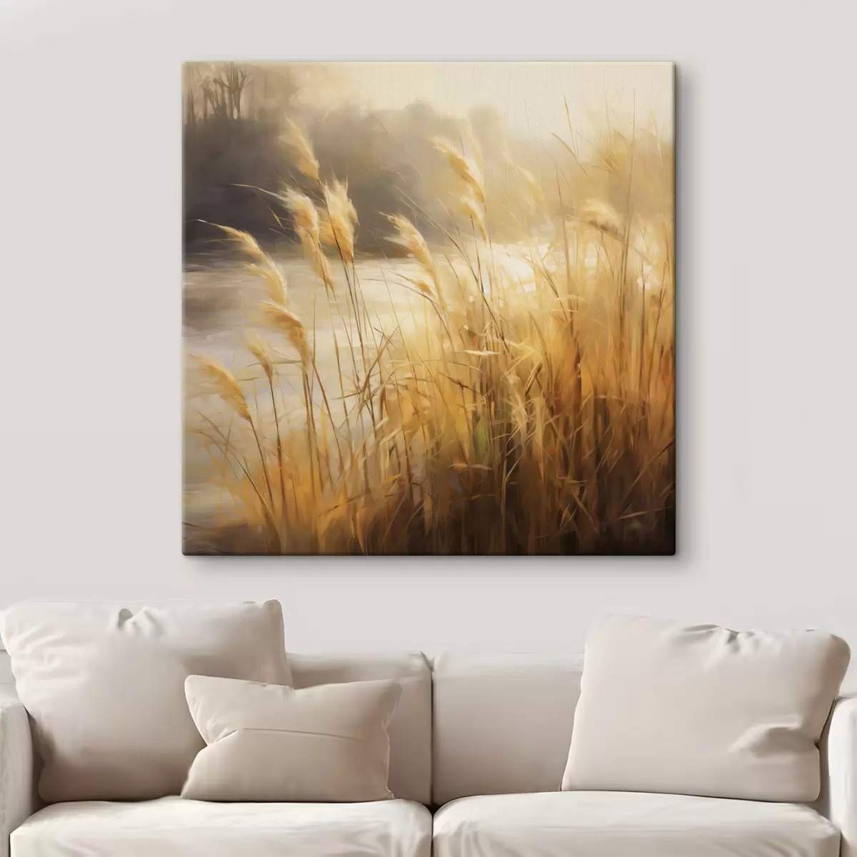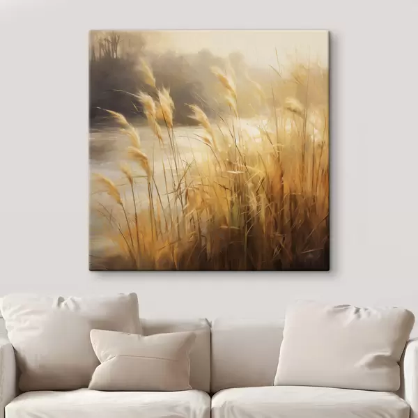 Pictură pe pânză Iarbă înaltă, cu spiculețe uscate, în prim-plan, cu un lac și copaci în fundal Nr s48394