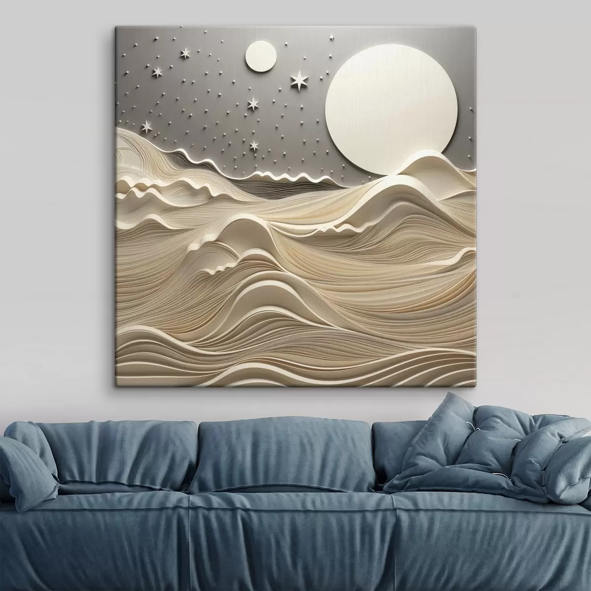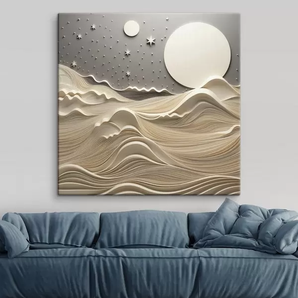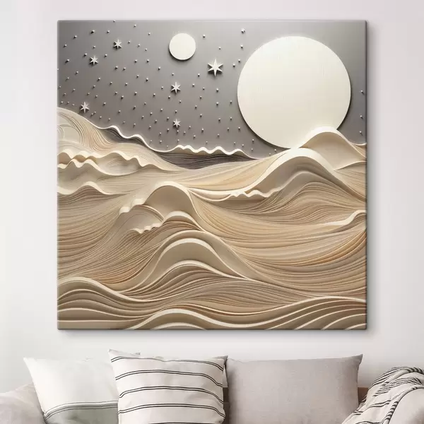 Pictură pe pânză Un peisaj minimalist stilizat, cu dealuri ondulate și o lună mare pe un cer înstelat, artă abstractă Nr s48401