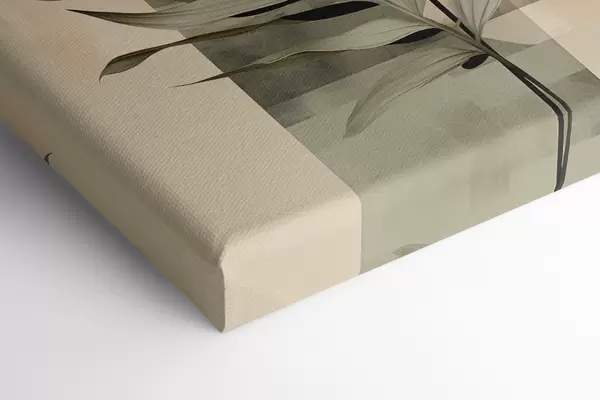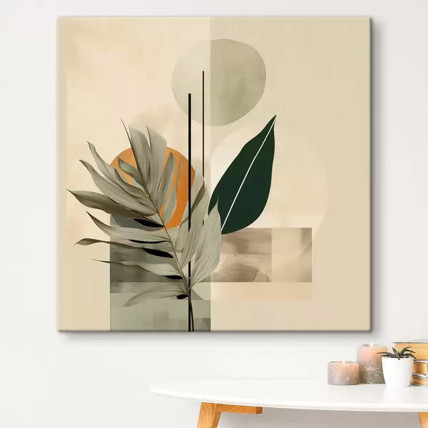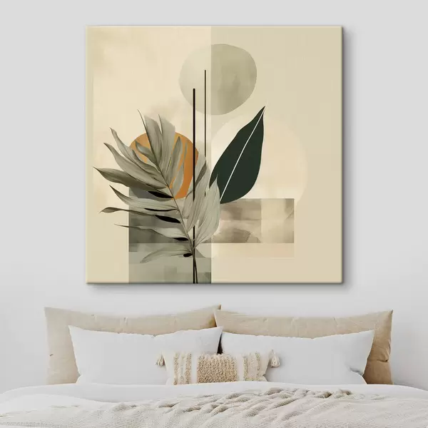 Pictură pe pânză O plantă de culoare verde închis, cu forme geometrice abstracte și texturi de acuarelă în nuanțe de bej și verde Nr s48410
