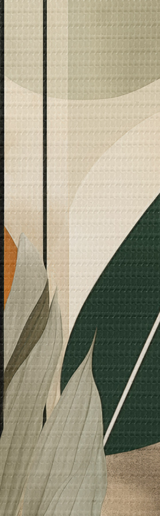 Tablouri O plantă de culoare verde închis, cu forme geometrice abstracte și texturi de acuarelă în nuanțe de bej și verde s48410