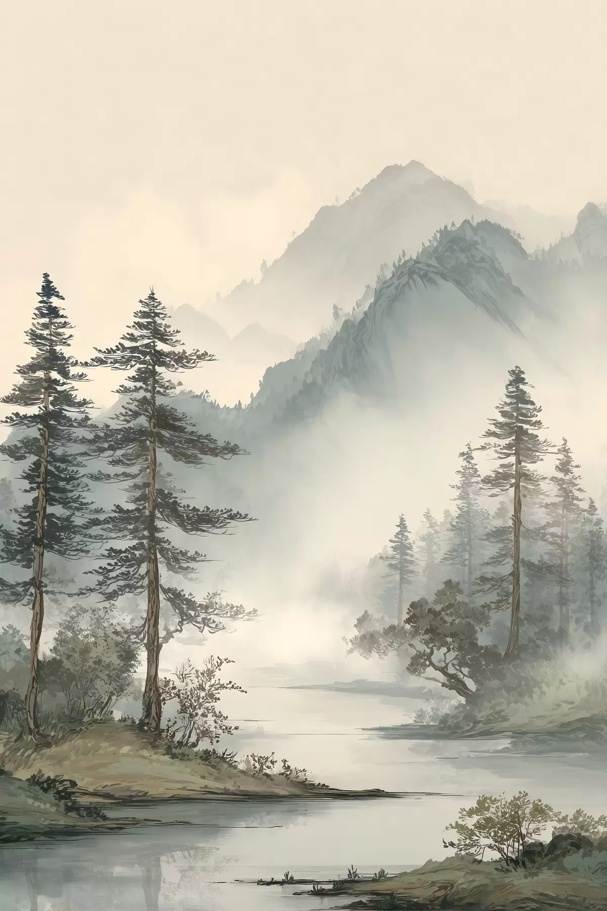 Tablouri un peisaj montan cu pini și un râu s48532