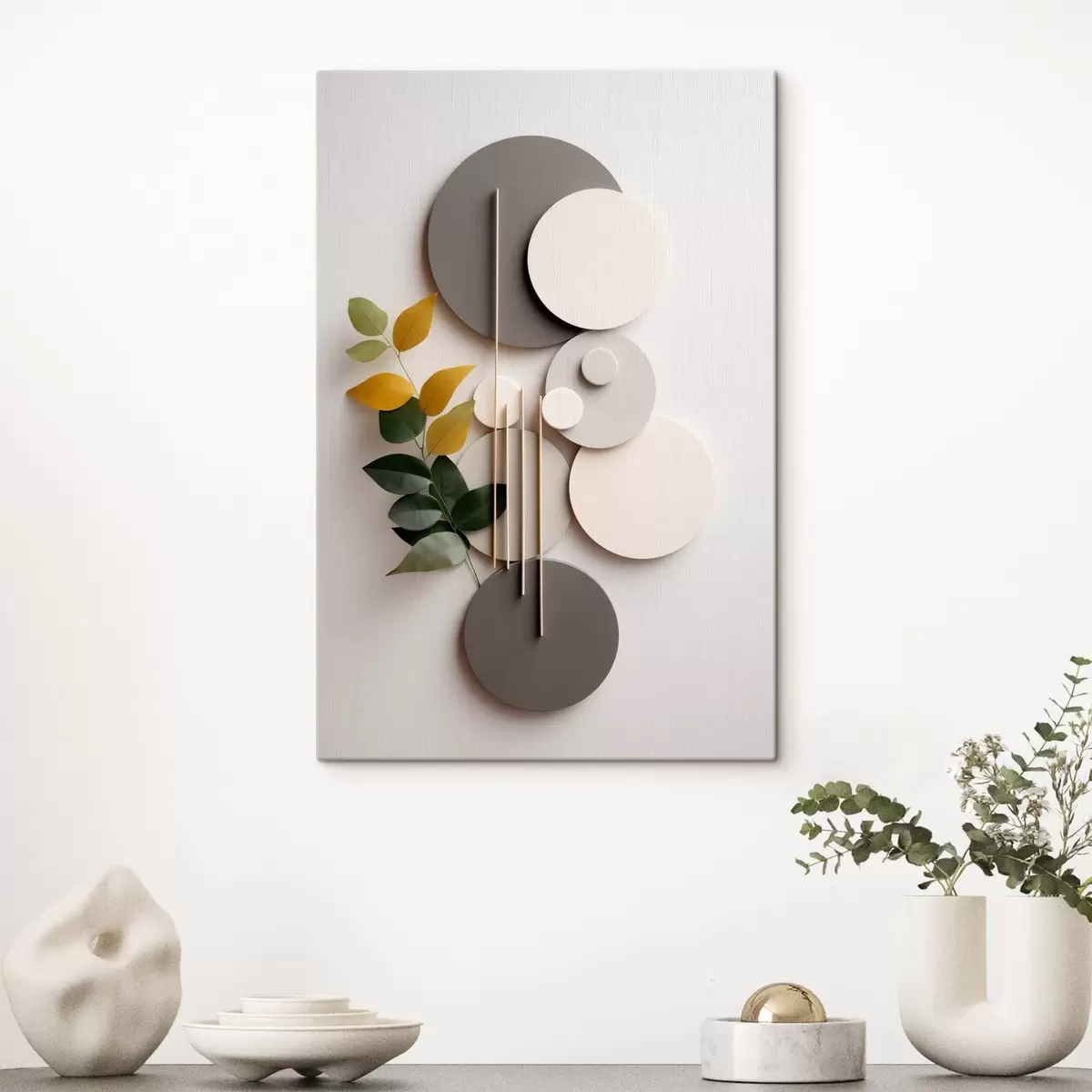 Tablouri Cercuri geometrice cu o ramură verde cu frunze s48598