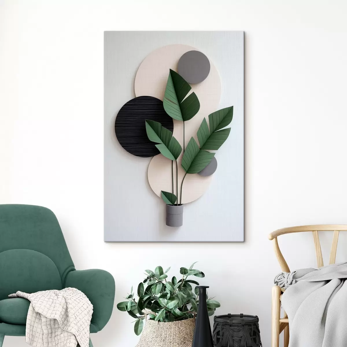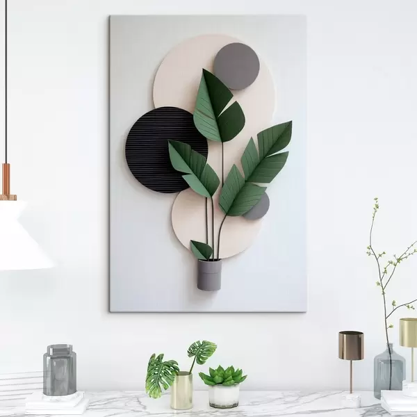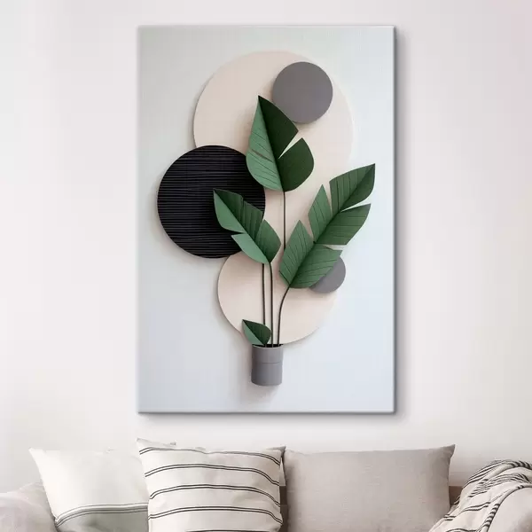 Pictură pe pânză Compoziție minimalistă cu cercuri geometrice și frunze verzi Nr s48607