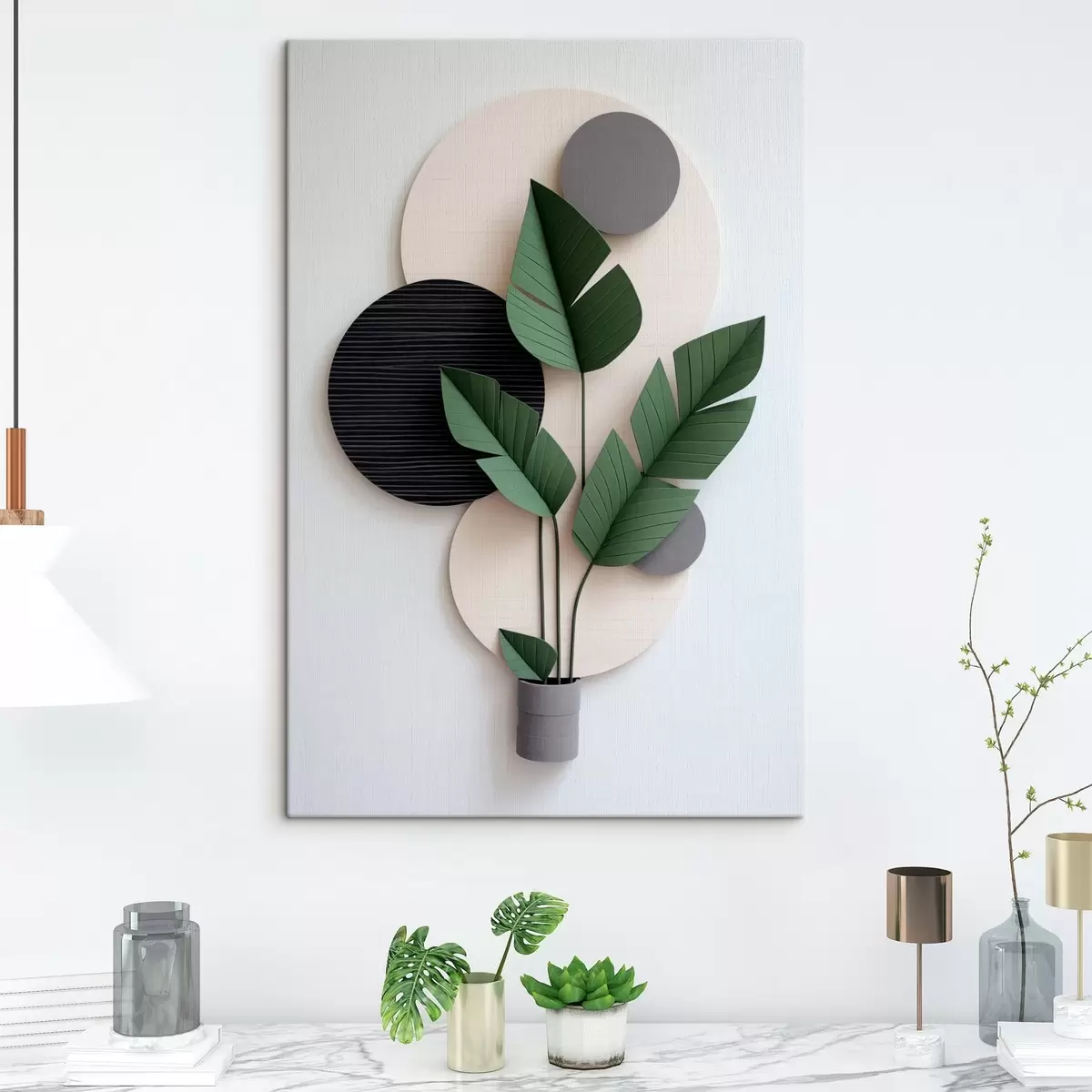Tablouri Compoziție minimalistă cu cercuri geometrice și frunze verzi s48607