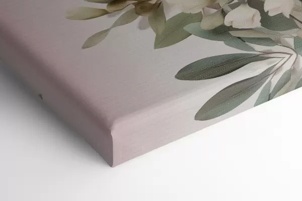 Pictură pe pânză Un buchet de flori în nuanțe pastelate, cu frunze de eucalipt, pe un fundal roz pal Nr s48728