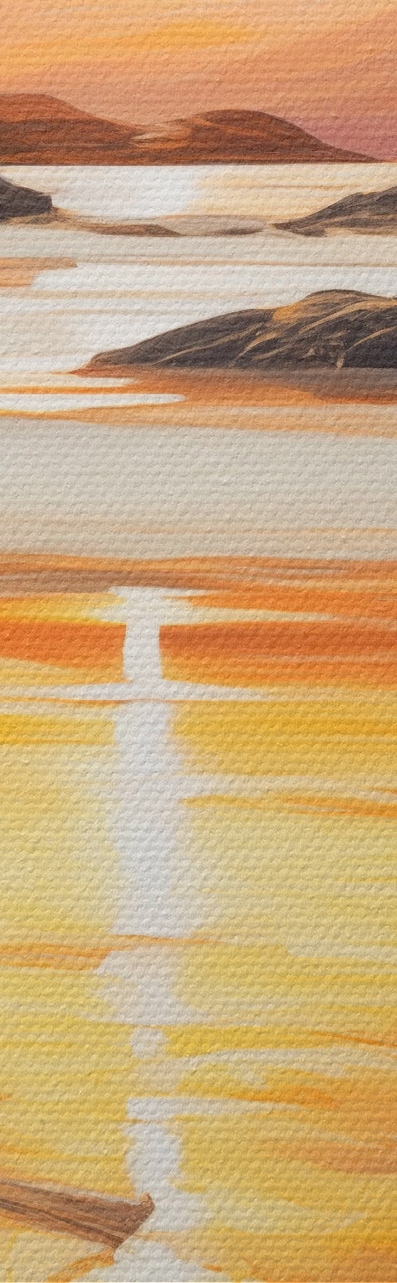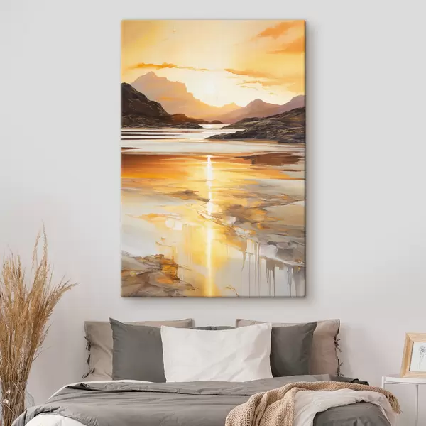 Pictură pe pânză Un peisaj cu un râu și munți sub un cer portocaliu cald, la apus Nr s48755