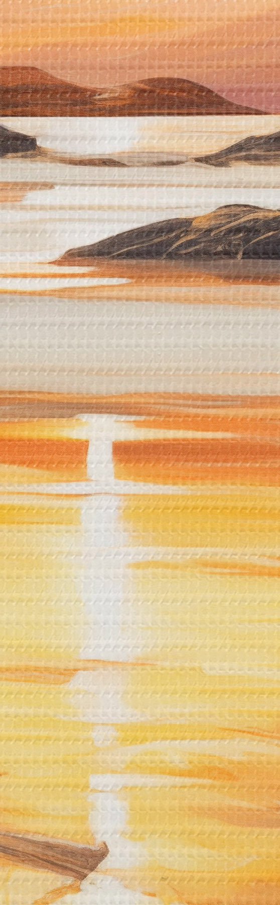 Tablouri Un peisaj cu un râu și munți sub un cer portocaliu cald, la apus s48755