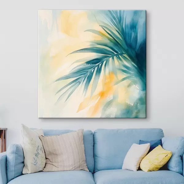 Pictură pe pânză Frunze de palmier tropicale într-o paletă de culori albastru-turcoaz, pe un fundal de pete calde de acuarelă Nr s48849