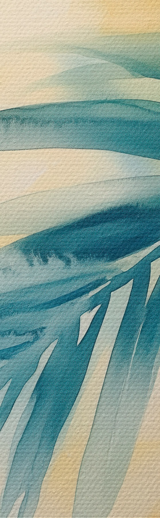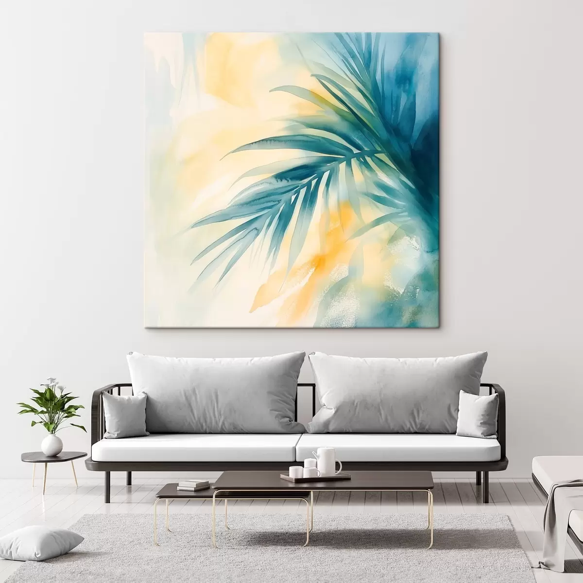 Tablouri Frunze de palmier tropicale într-o paletă de culori albastru-turcoaz, pe un fundal de pete calde de acuarelă s48849