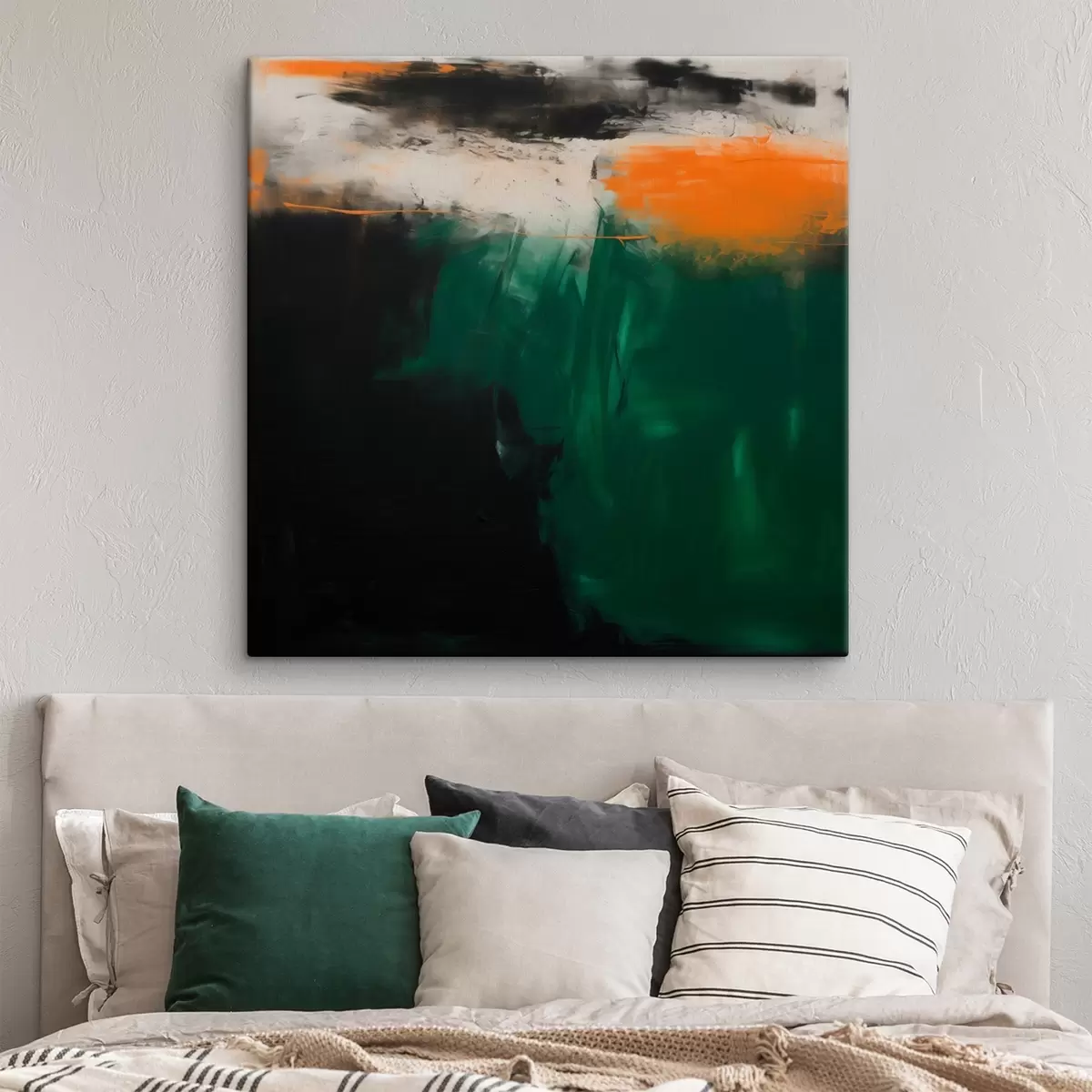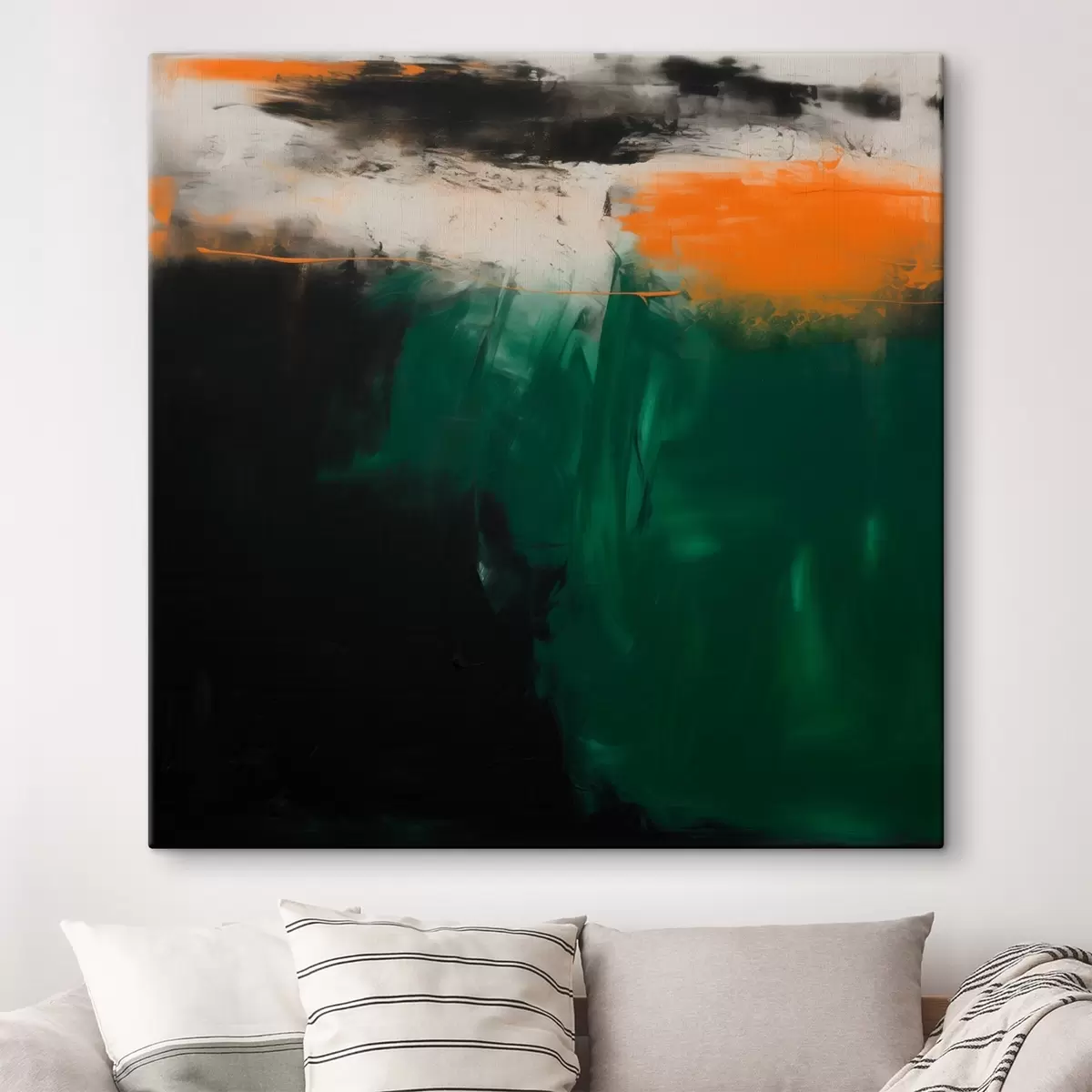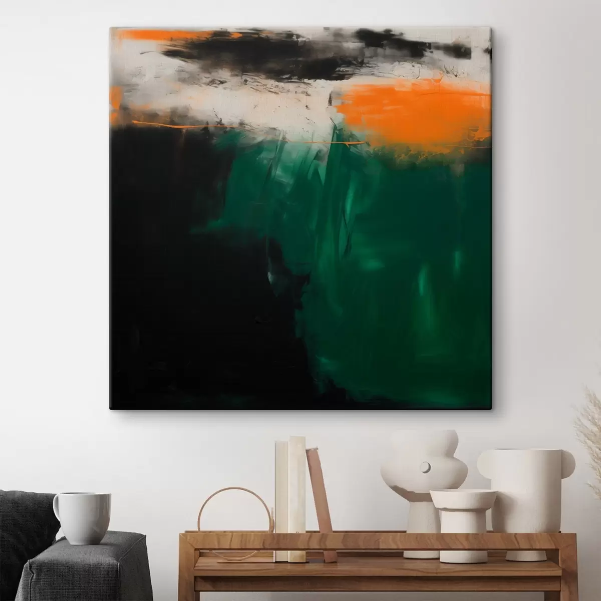 Tablouri O pictură abstractă cu accente portocalii și tușe de verde intens, realizată într-un stil contemporan s48865