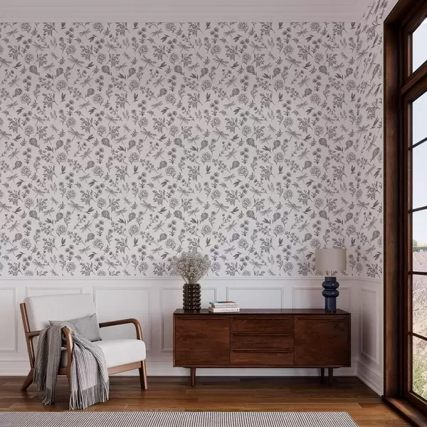 Tapet Flori, frunze și libelule pe fundal alb Nr. a00025v1