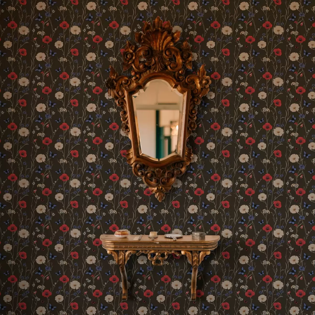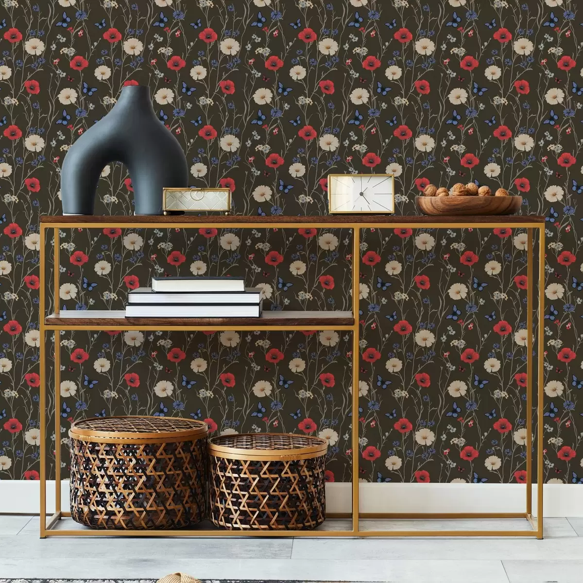 Tapet Papioane, margarete și fluturi pe un fundal întunecat Nr. a00072v2