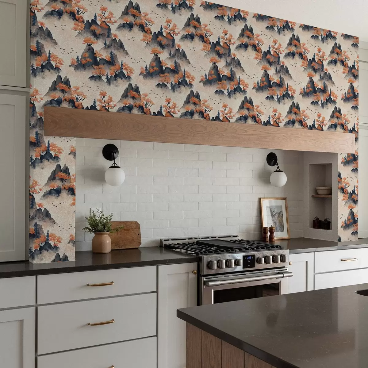 Tapet Munți de toamnă în ceață cu copaci portocalii și păsări Nr. a00104