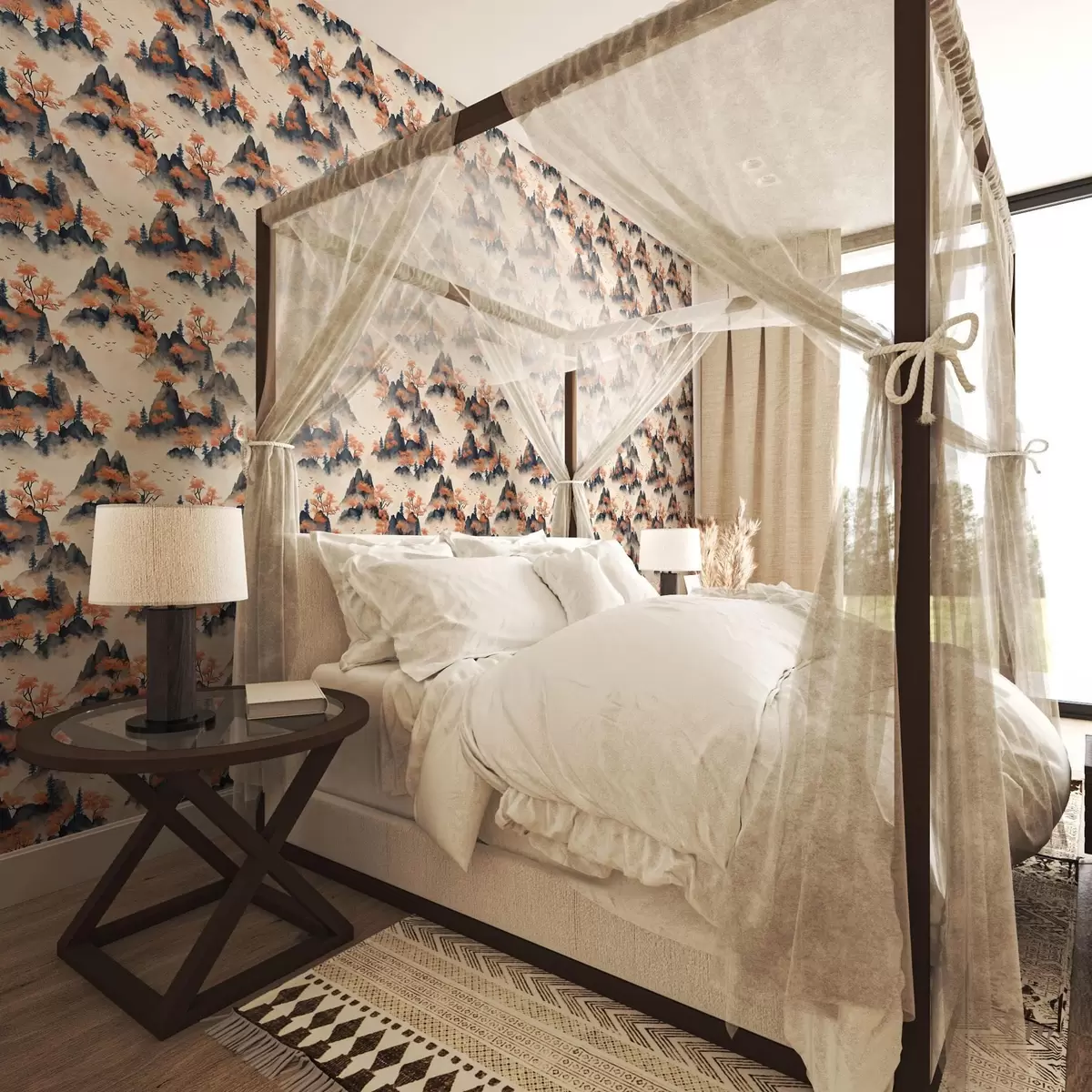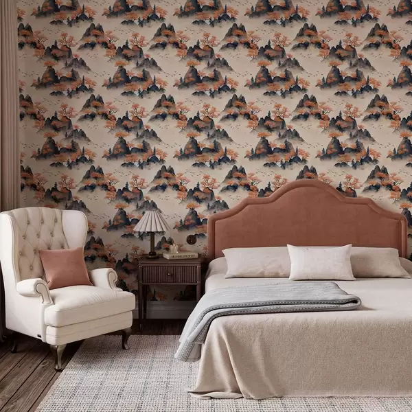 Tapet Munți de toamnă în ceață cu copaci portocalii și păsări Nr. a00104