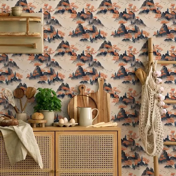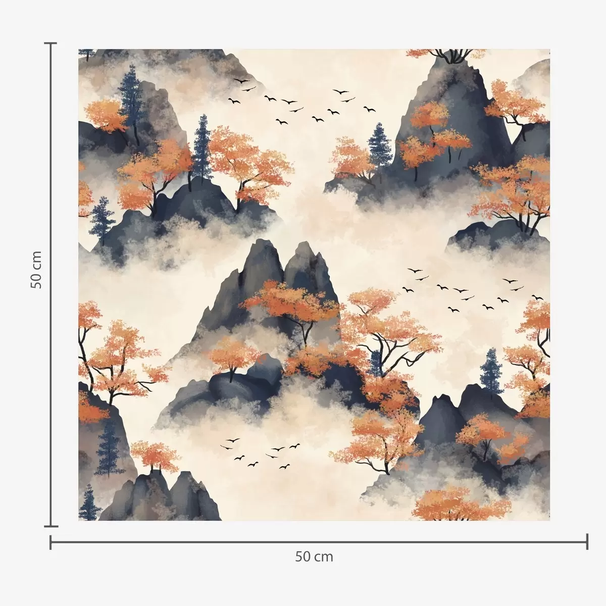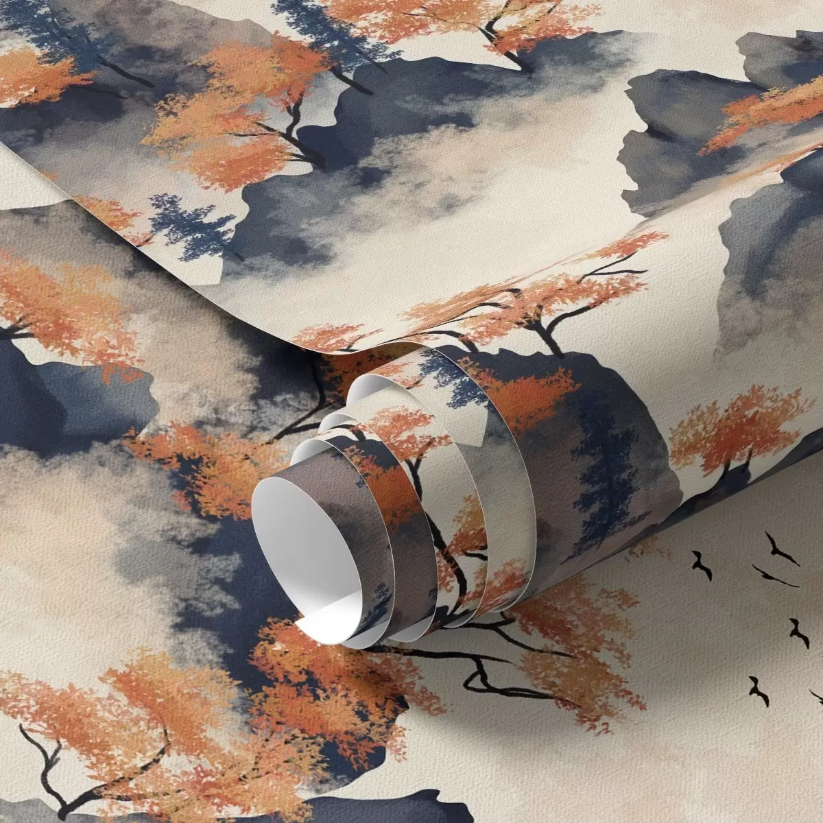 Tapet Munți de toamnă în ceață cu copaci portocalii și păsări Nr. a00104