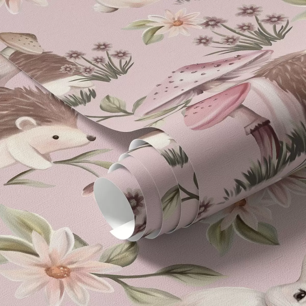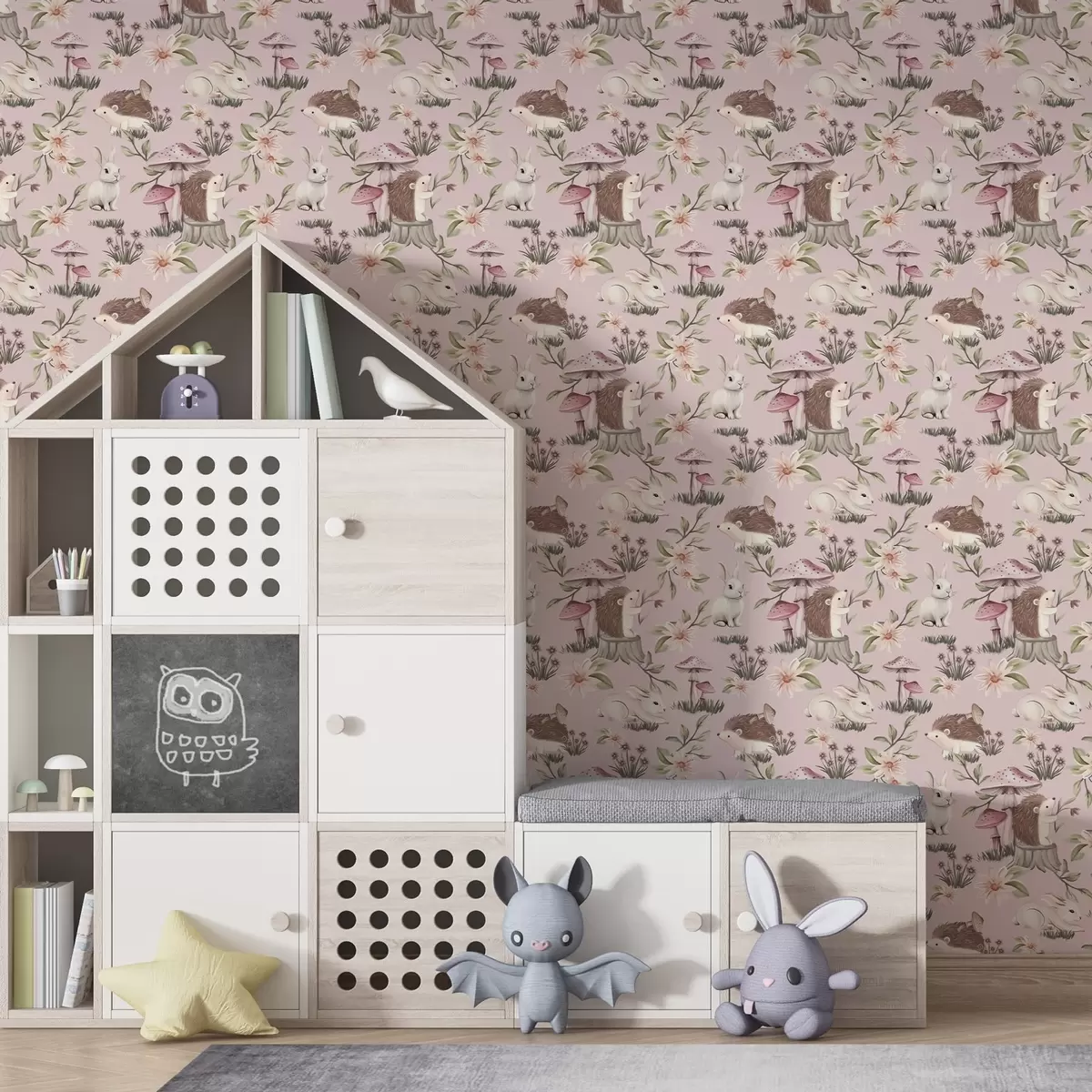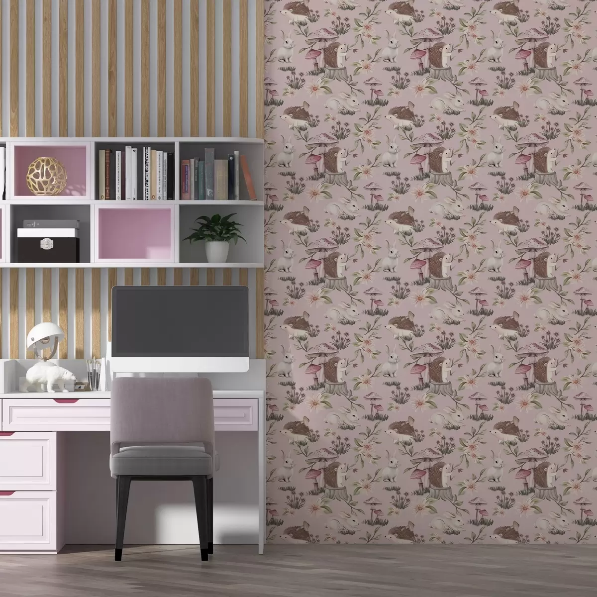 Tapet Arici stil basm, iepuri și flori printre ciuperci pe fundal roz Nr. a00111