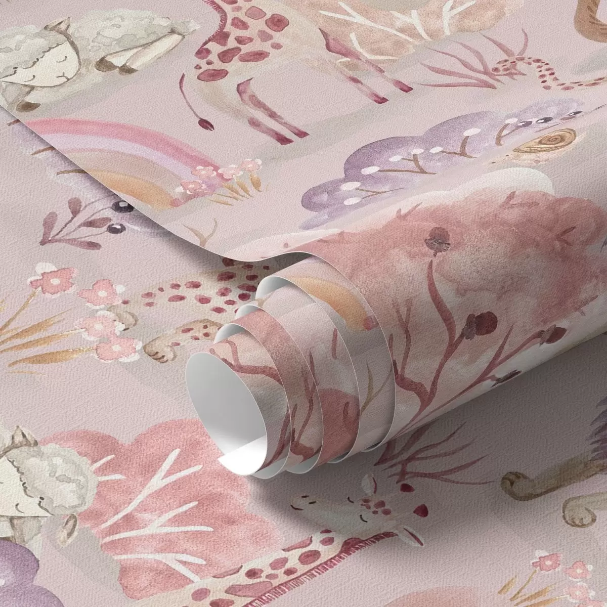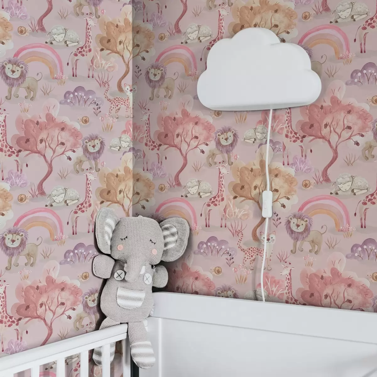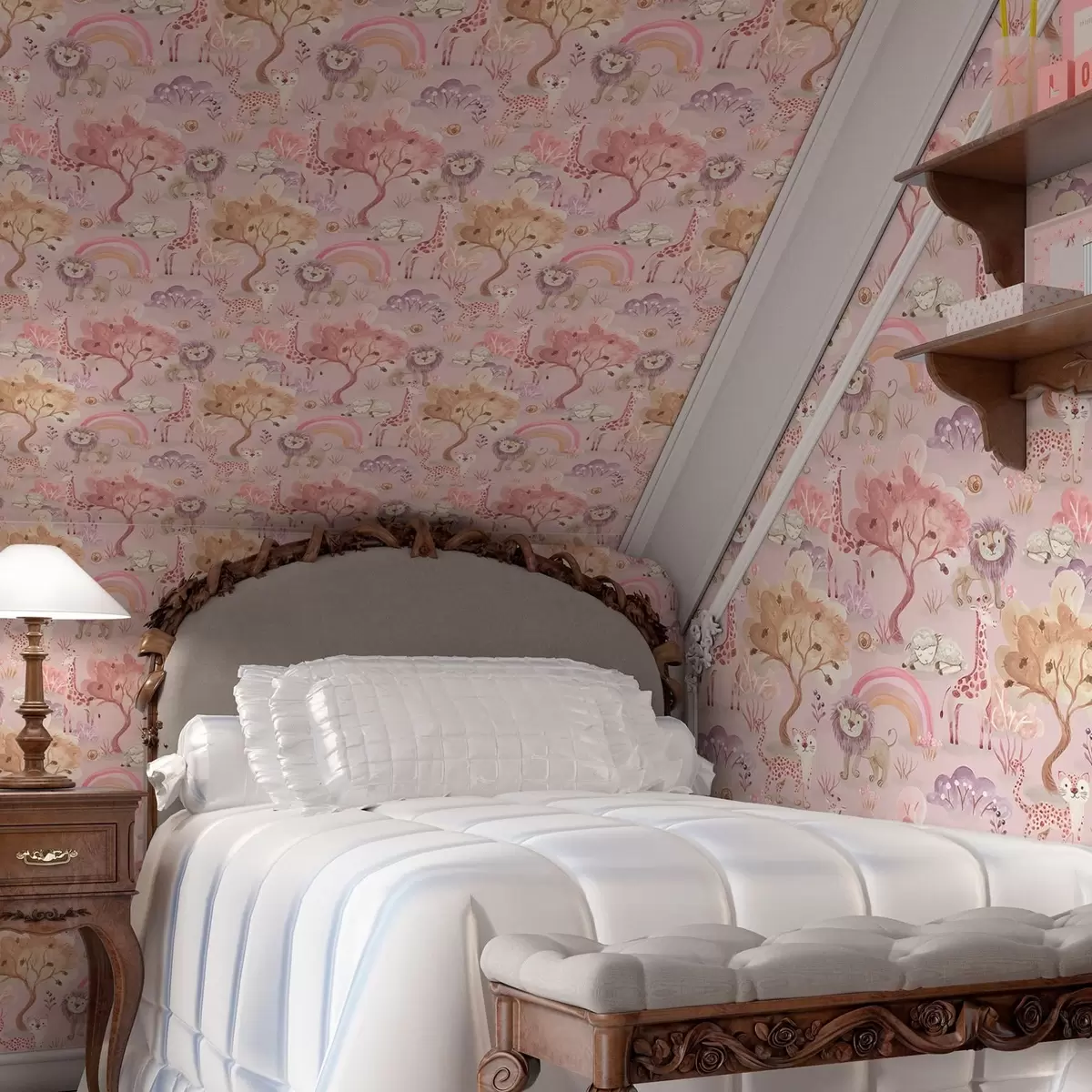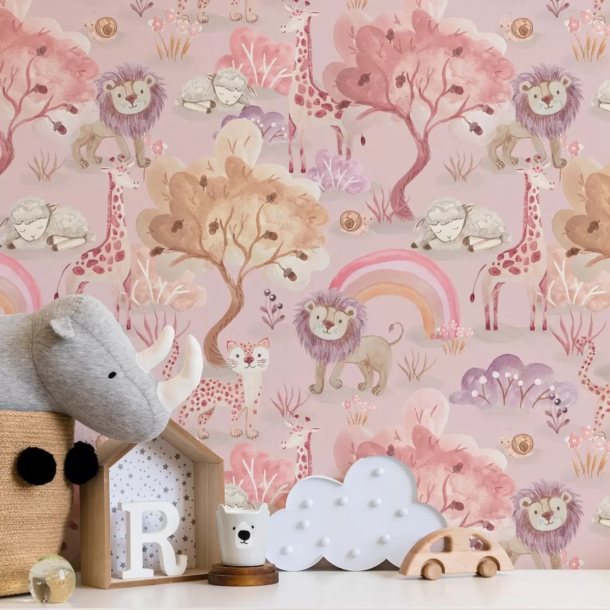 Tapet Pui de leu, girafe și curcubee într-o pădure pastelată Nr. a00112
