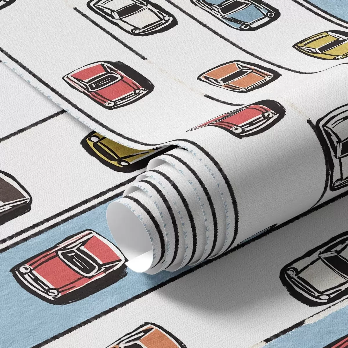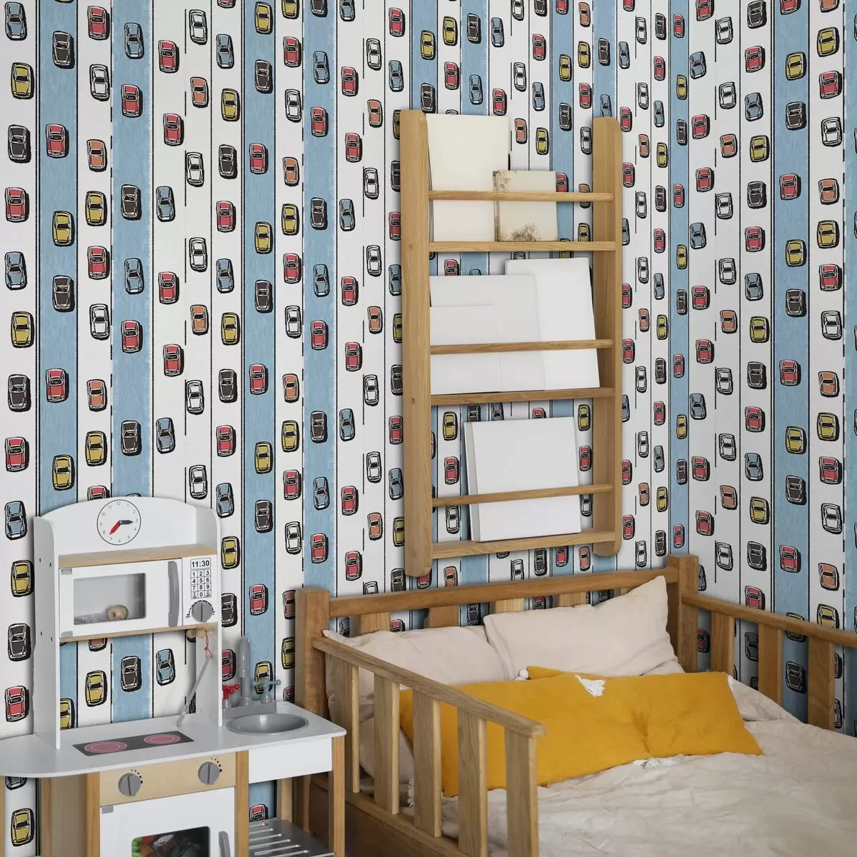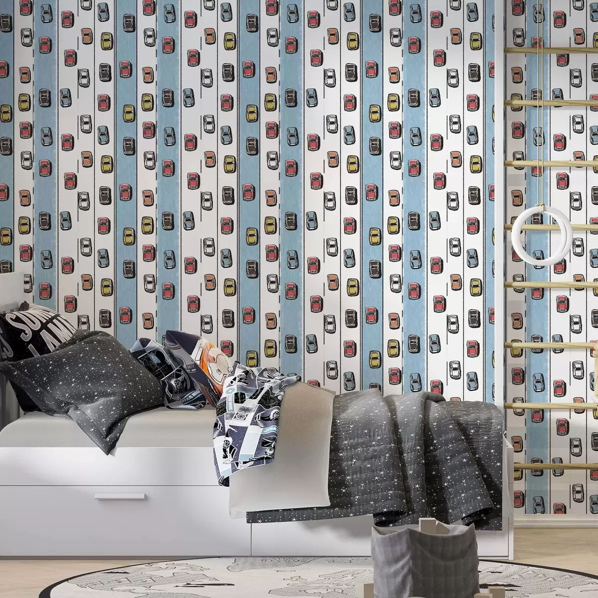 Tapet Mașină retro pe un drum alb și albastru în stilul anilor '60 Nr. a00118v2