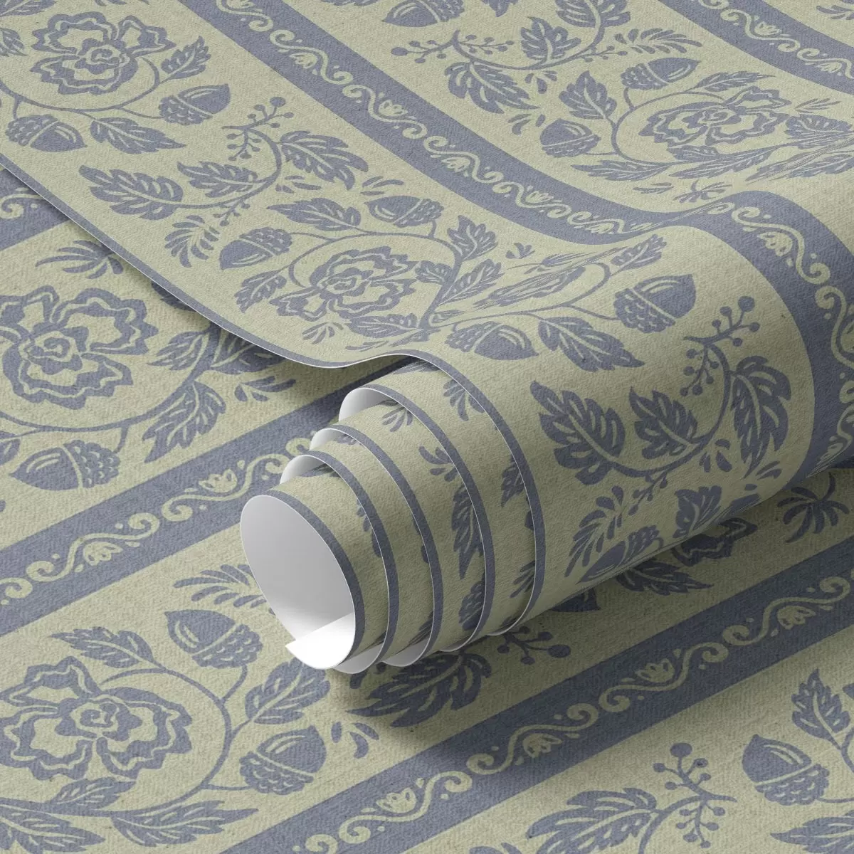 Wallpaper Ornament floral în dungi cu ghinde în tonuri de albastru și bej a00181