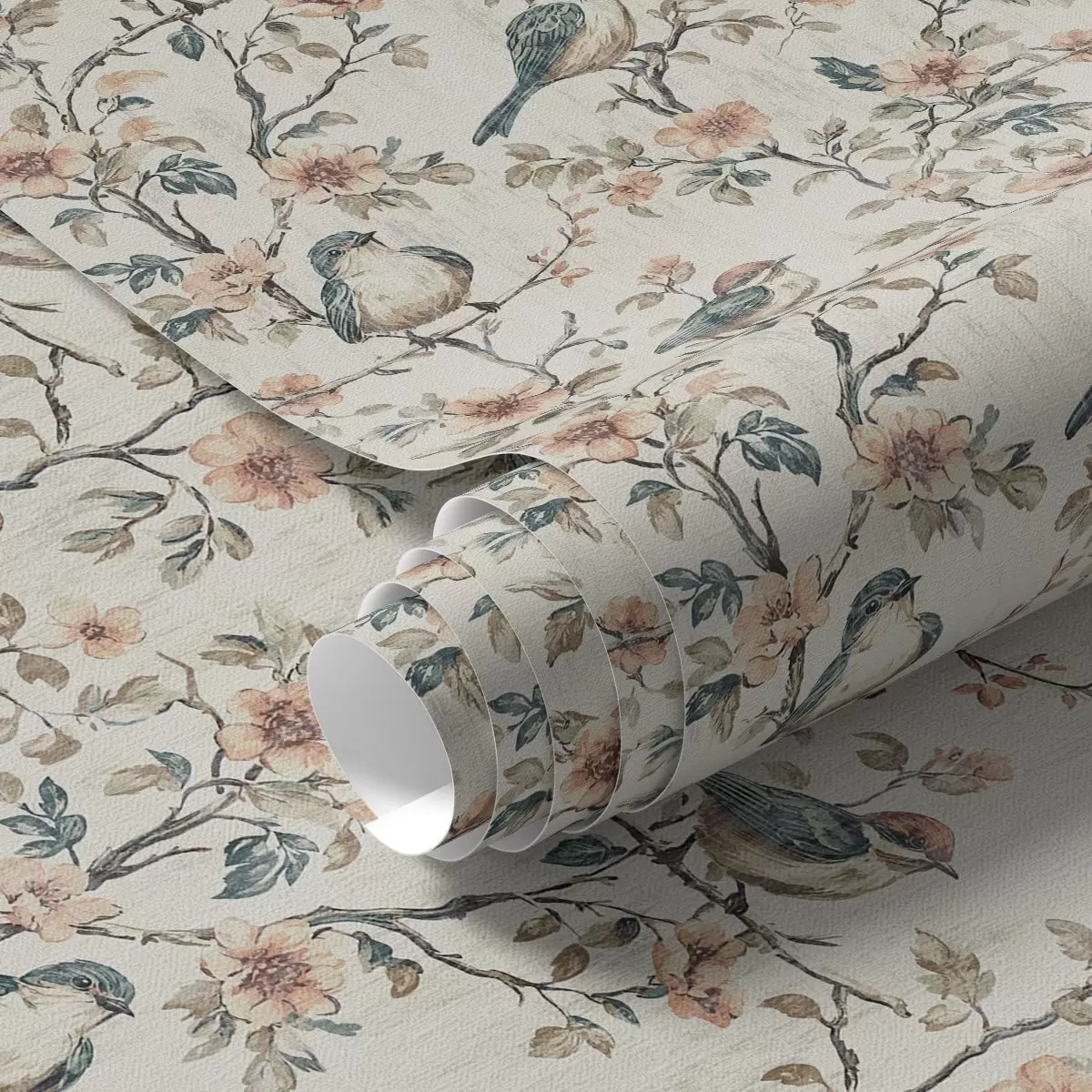 Tapet Păsări pe ramuri cu flori în stil retro acuarelă Nr. a00197