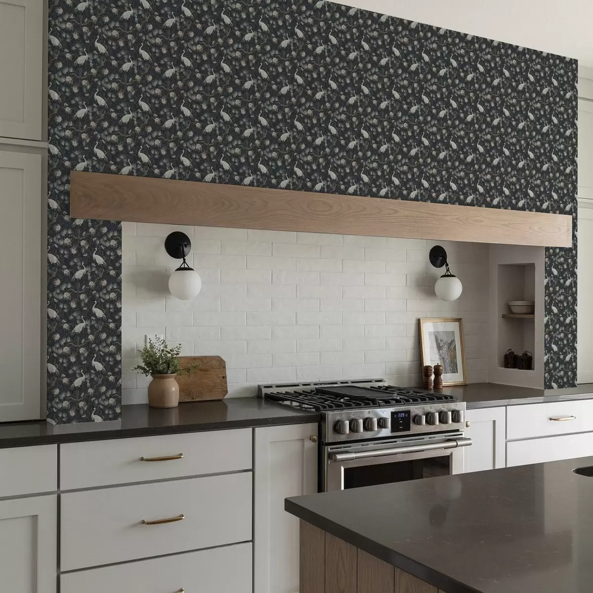 Tapet Cranes printre pini și bujori pe un fundal întunecat Nr. a00241