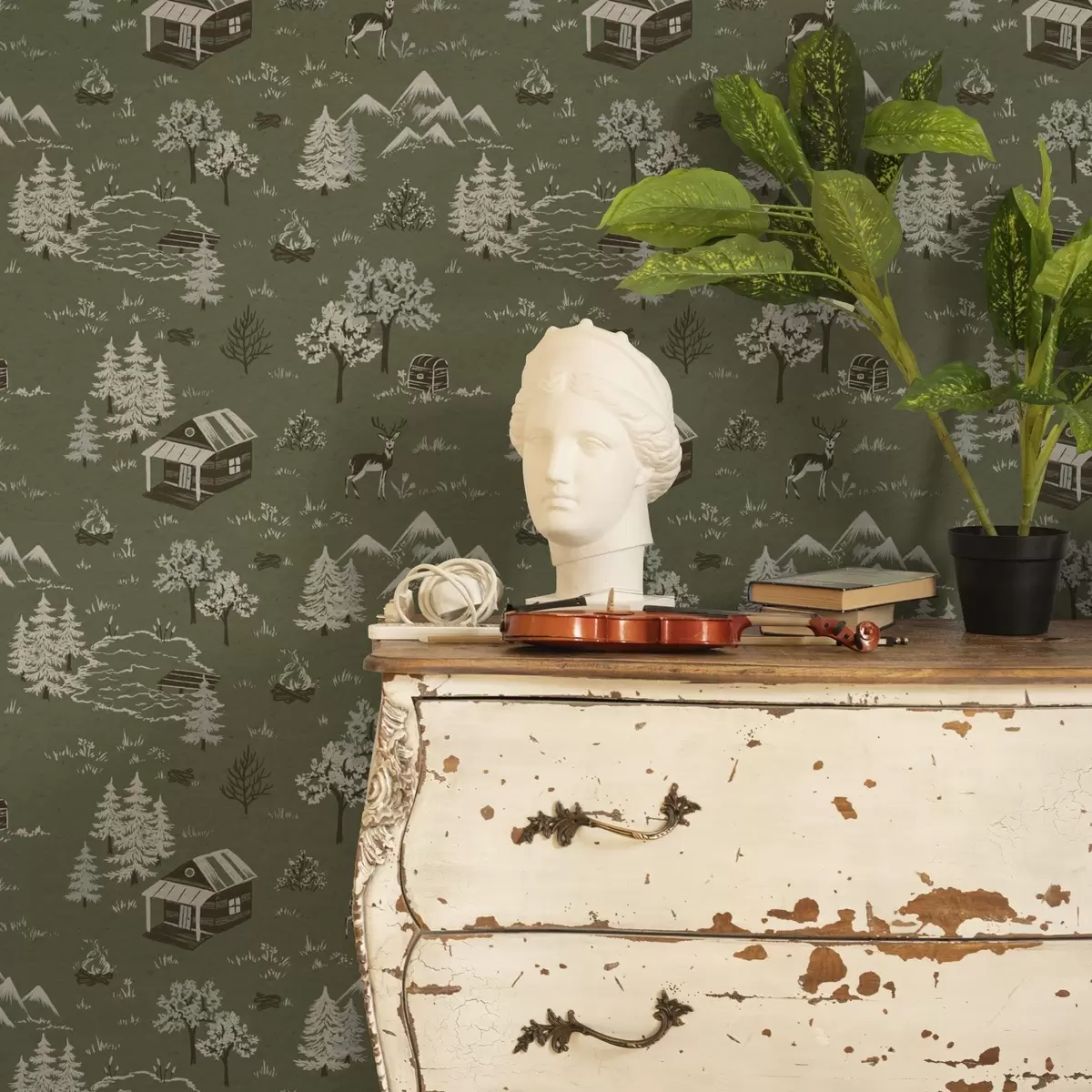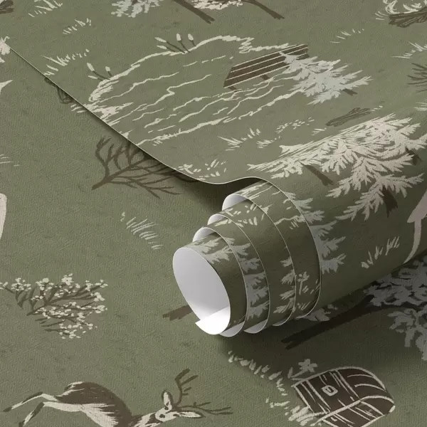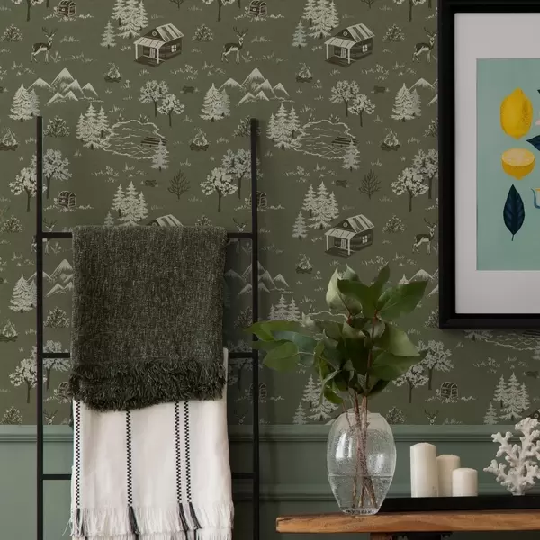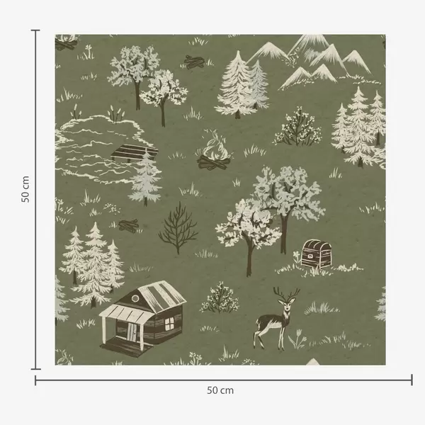 Tapet Pădure pictată cu un lac, cabană și animale Nr. a00267