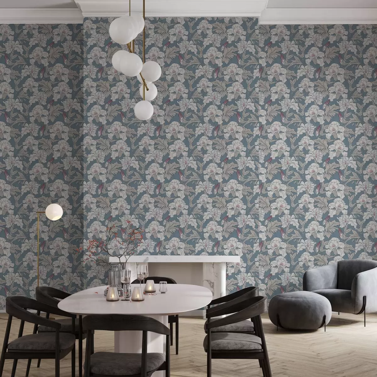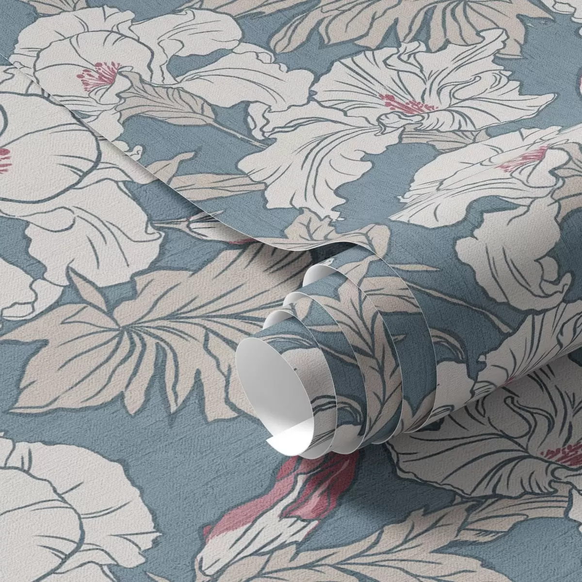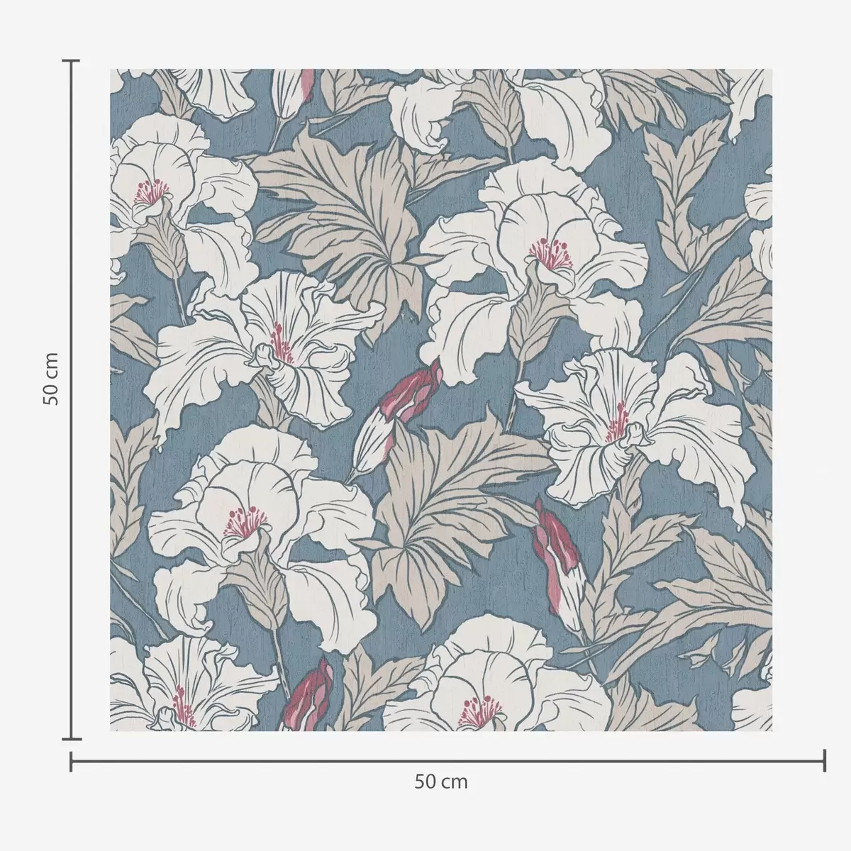 Tapet Hibiscus alb pe fundal albastru cu model de contur Nr. a00272v1