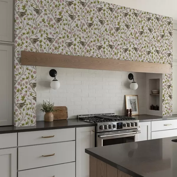 Tapet Păsări pe ramuri cu frunze și fructe de pădure pe un fundal alb Nr. a00283