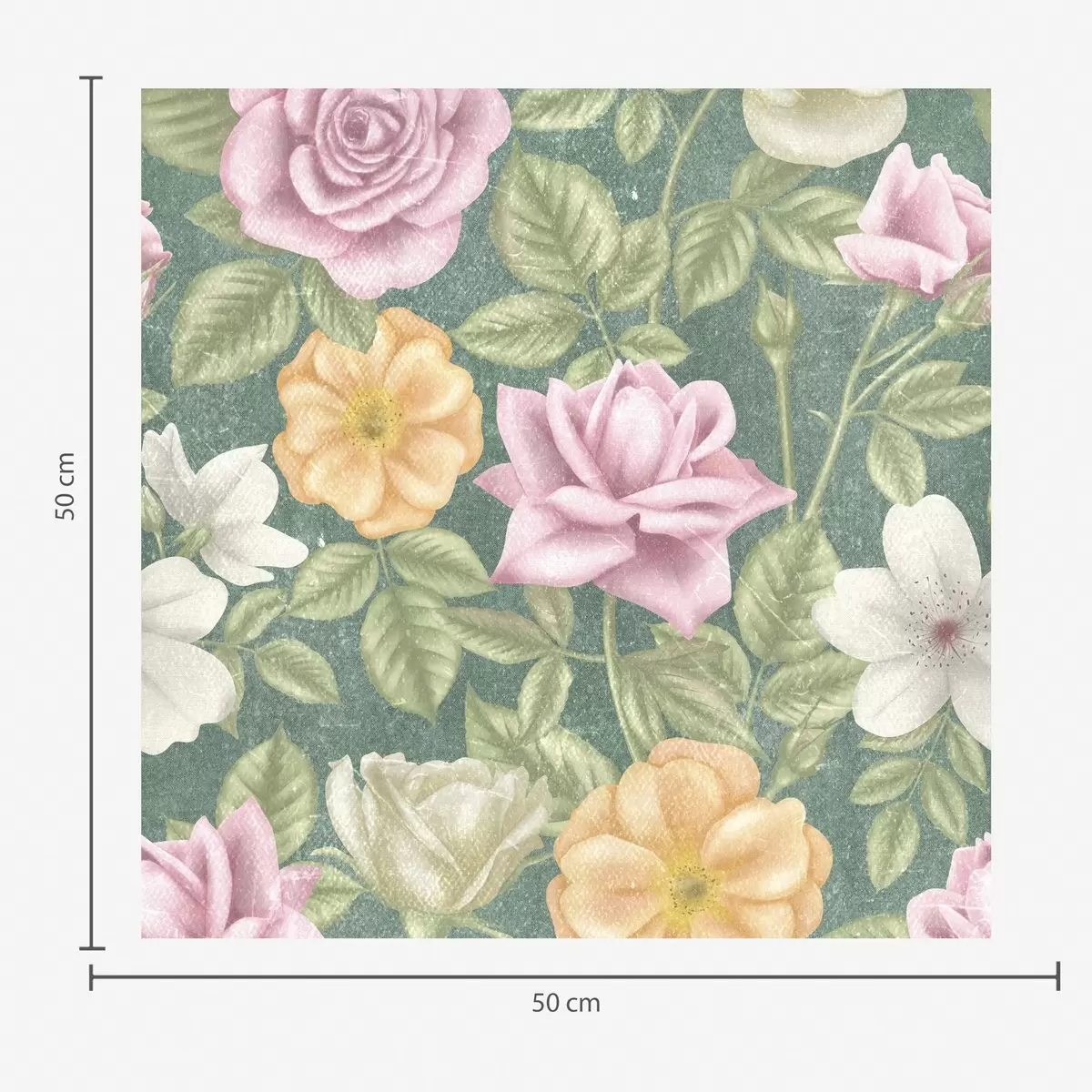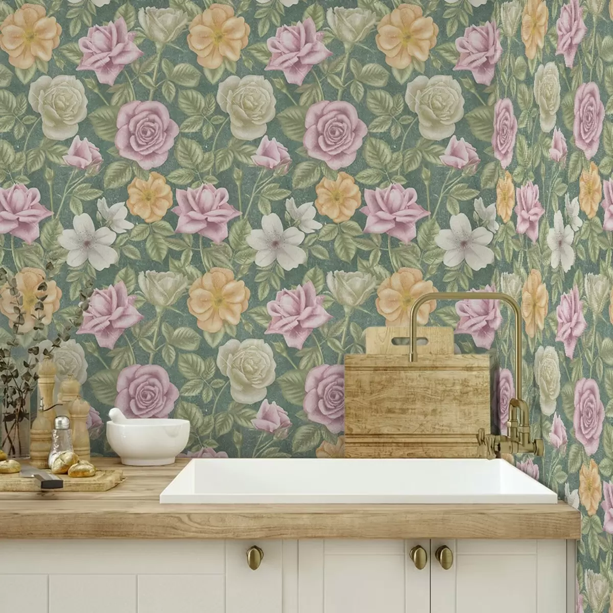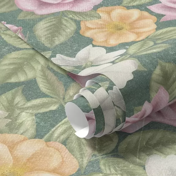 Tapet Roz crem și trandafiri galbeni pe un fundal verde Nr. a00300