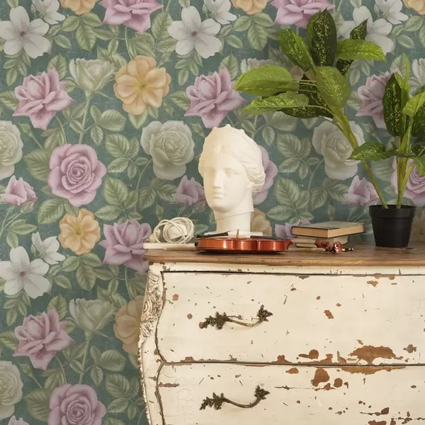 Tapet Roz crem și trandafiri galbeni pe un fundal verde Nr. a00300