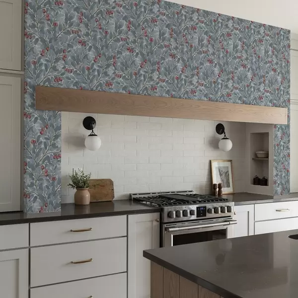 Tapet Frunze albastre cu crenguțe de fructe de pădure roșii Nr. a00309