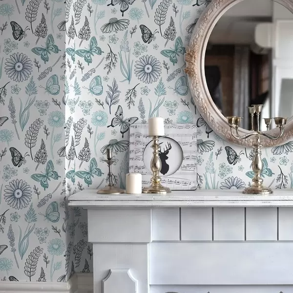 Tapet Conturați fluturi și flori în tonuri de albastru și albastru Nr. a00311